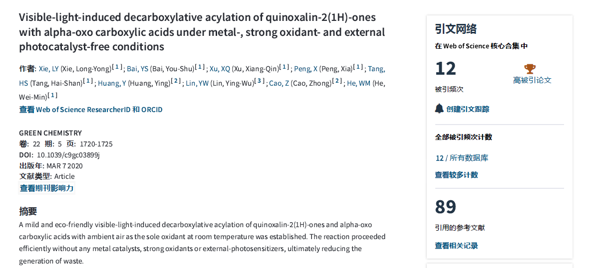 本网讯 根据基本科学指标库ESI(Essential Science Indicators)的最新统计数据,2020年华体会官方版网站登录入口化学与生物工程学院有4篇论文入选了ESI全球TOP1%高被引论文。这4篇高被引论文包括化生院谢龙勇博士以第一作者身份在GREEN CHEMISTRY发表的< >, 化生院刘开建博士以第一作者身份在GREEN CHEMISTRY发表的 < > ,何卫民博士以通讯作者身份在GREEN CHEMISTRY发表的《Visible-light-initiated regioselective sulfonylation/cyclization of 1,6-enynesunder photocatalyst- and additive-free conditions》以及化生院覃佐东博士以并列第一作者在DRUG RESISTANCE UPDATES发表的《Medicinal chemistry strategies to discover P-glycoprotein inhibitors: An update》。