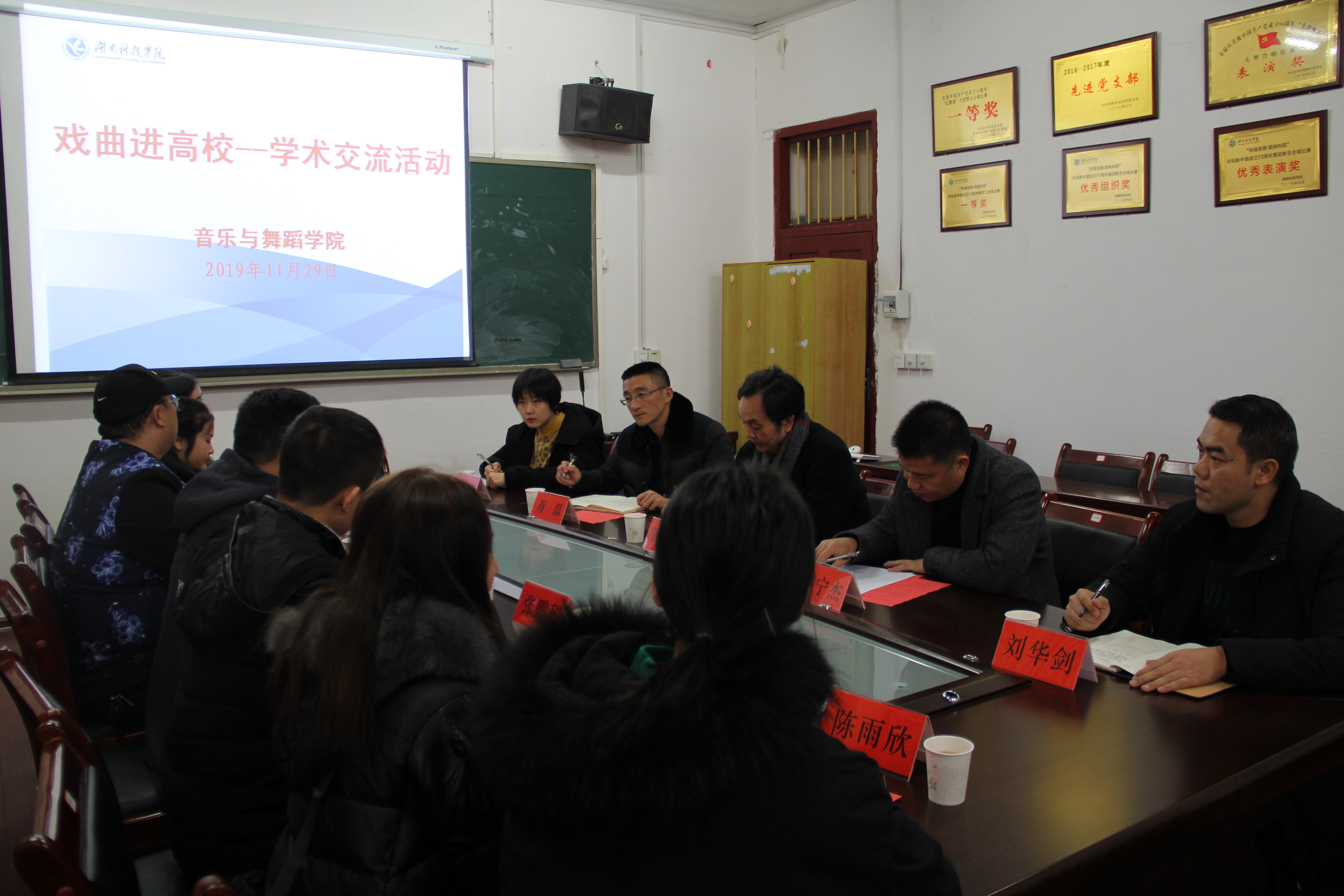 本网讯 11月29日下午,音乐与舞蹈学院在荟英楼举行戏曲进高校学术交流活动。祁阳祁剧团团长郑安顺,该院院长邹林波、党总支书记廖宁杰参加活动。