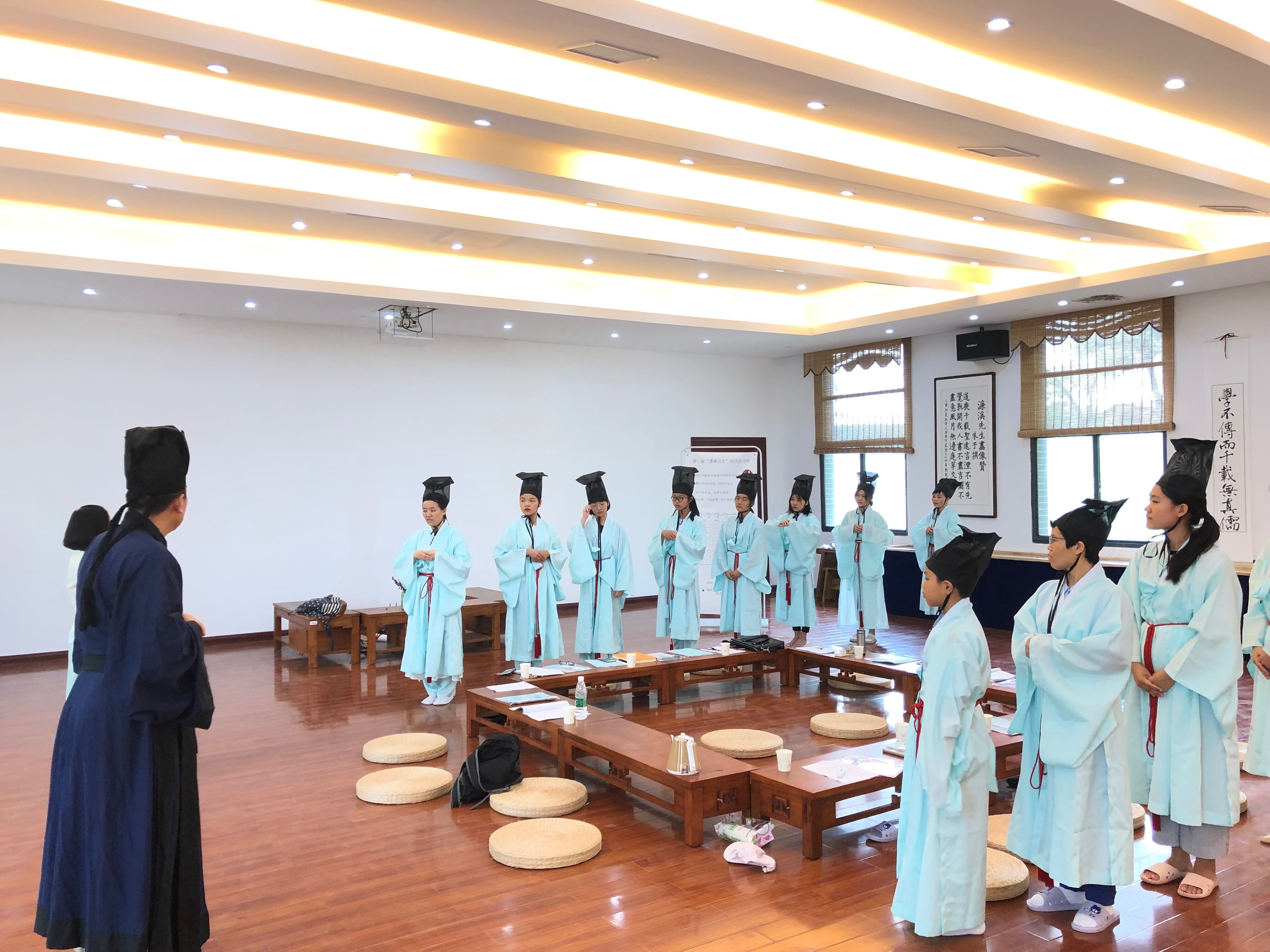 8月9日上午,来自四面八方的朋友同着汉服,在华体会官方版网站登录入口国学院小成堂进行了师生相见礼,代表着为期七天的第一届“潇湘会友”国学讲习班正式开班。参加此次讲习活动的成员有大学教师、研究生、大学生、中学生乃至小学生,并有学生家长及公务员旁听。