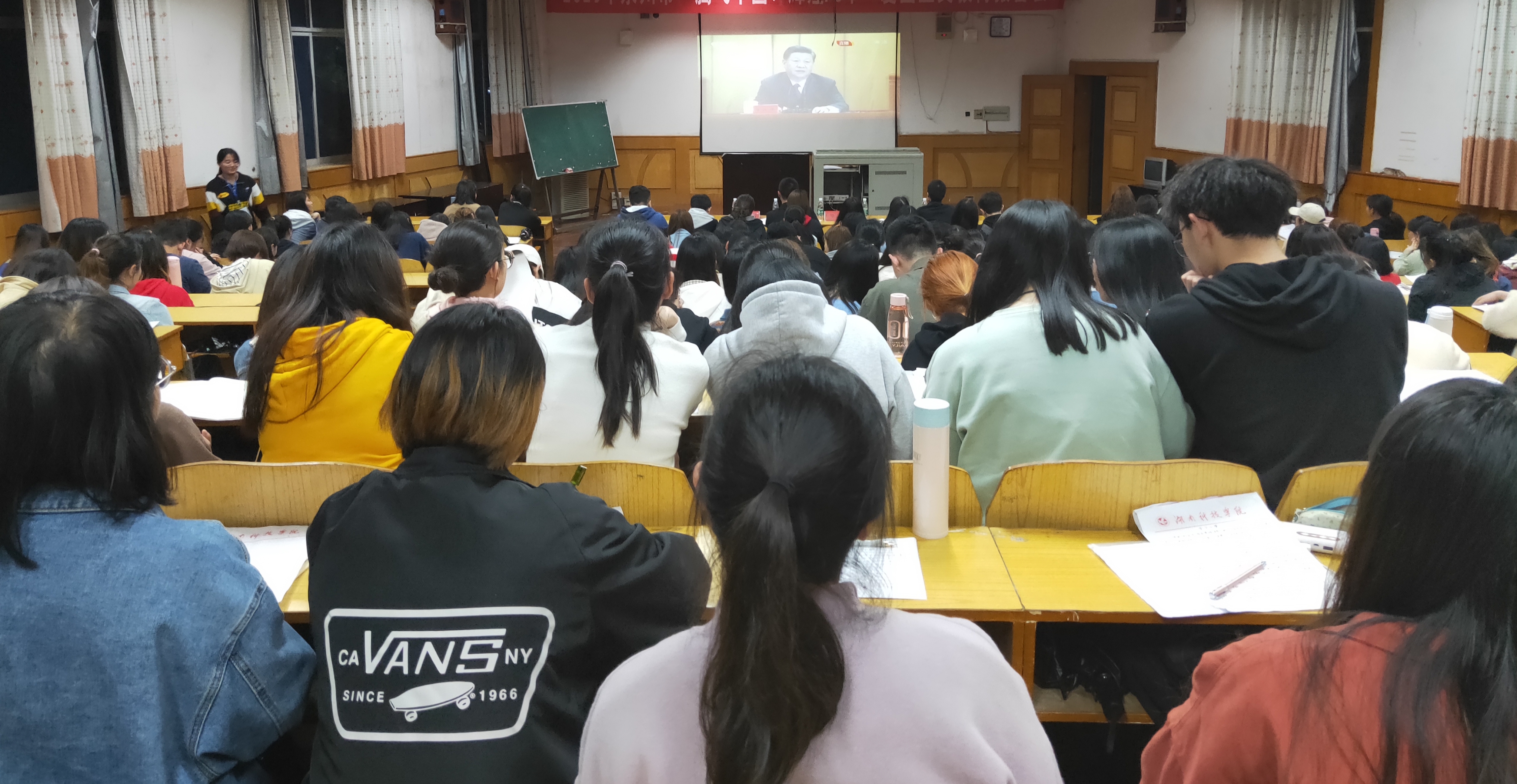 外国语学院组织全体辅导员和全体学生干部集中观看了纪念五四运动100周年大会实况。大家认真记录,深刻领会习近平总书记关于五四运动和做好青年工作的重要论述,深切体会总书记对广大青年的关心厚爱和殷切期望。该院党总支副书记罗晶希望大家坚定理想信念,勤奋学习,努力奋斗;发扬伟大五四精神,努力成为德智体美劳全面发展的社会主义建设者和接班人。