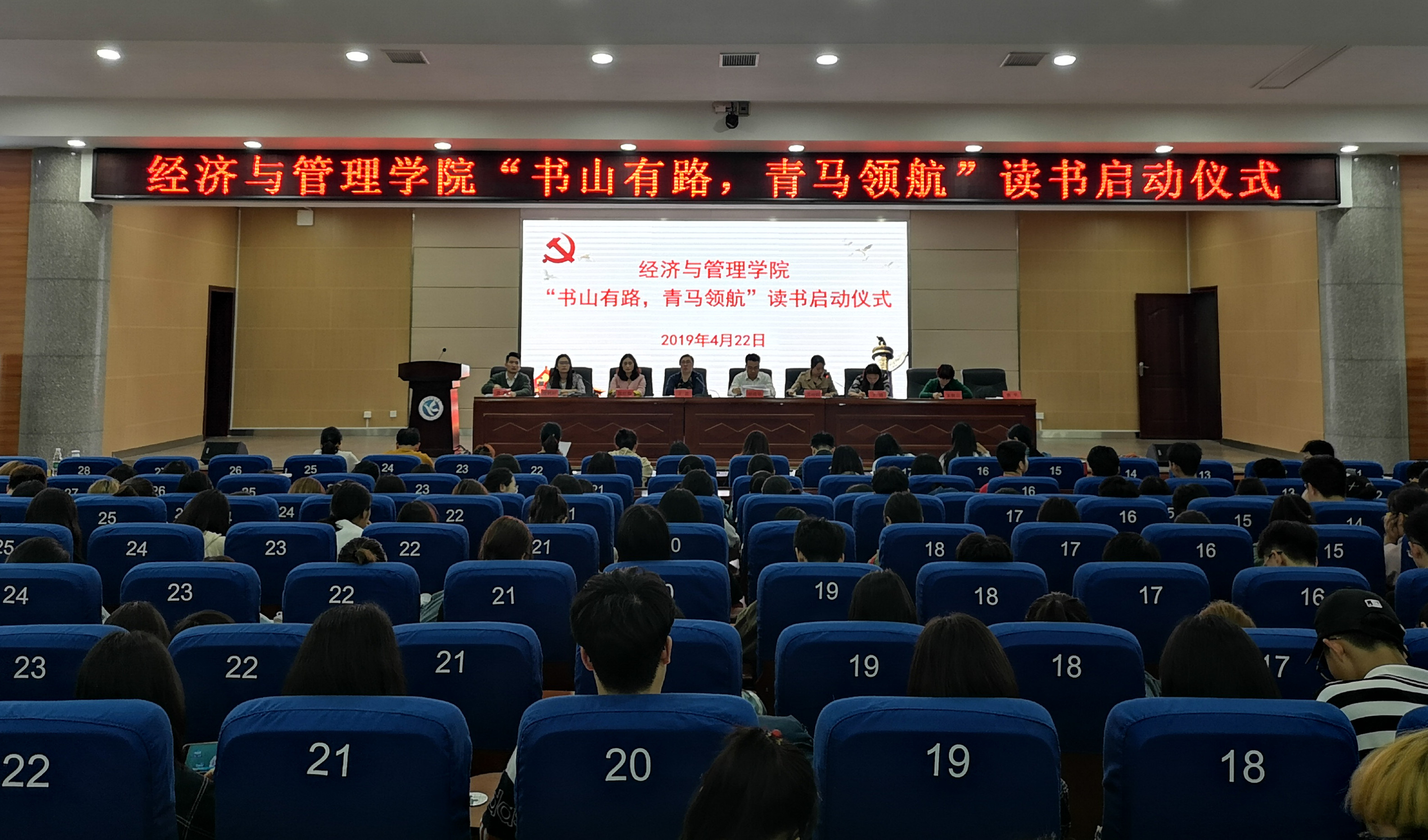 本网讯 4月22日晚,经济与管理学院“三学会,三争先,做‘三有’好青年”主题教育活动启动仪式暨“书山有路,青马领航”读书活动在潇湘大讲堂举行,该院党总支书记胡清华及全体班主任、辅导员、全院学生参加启动仪式。