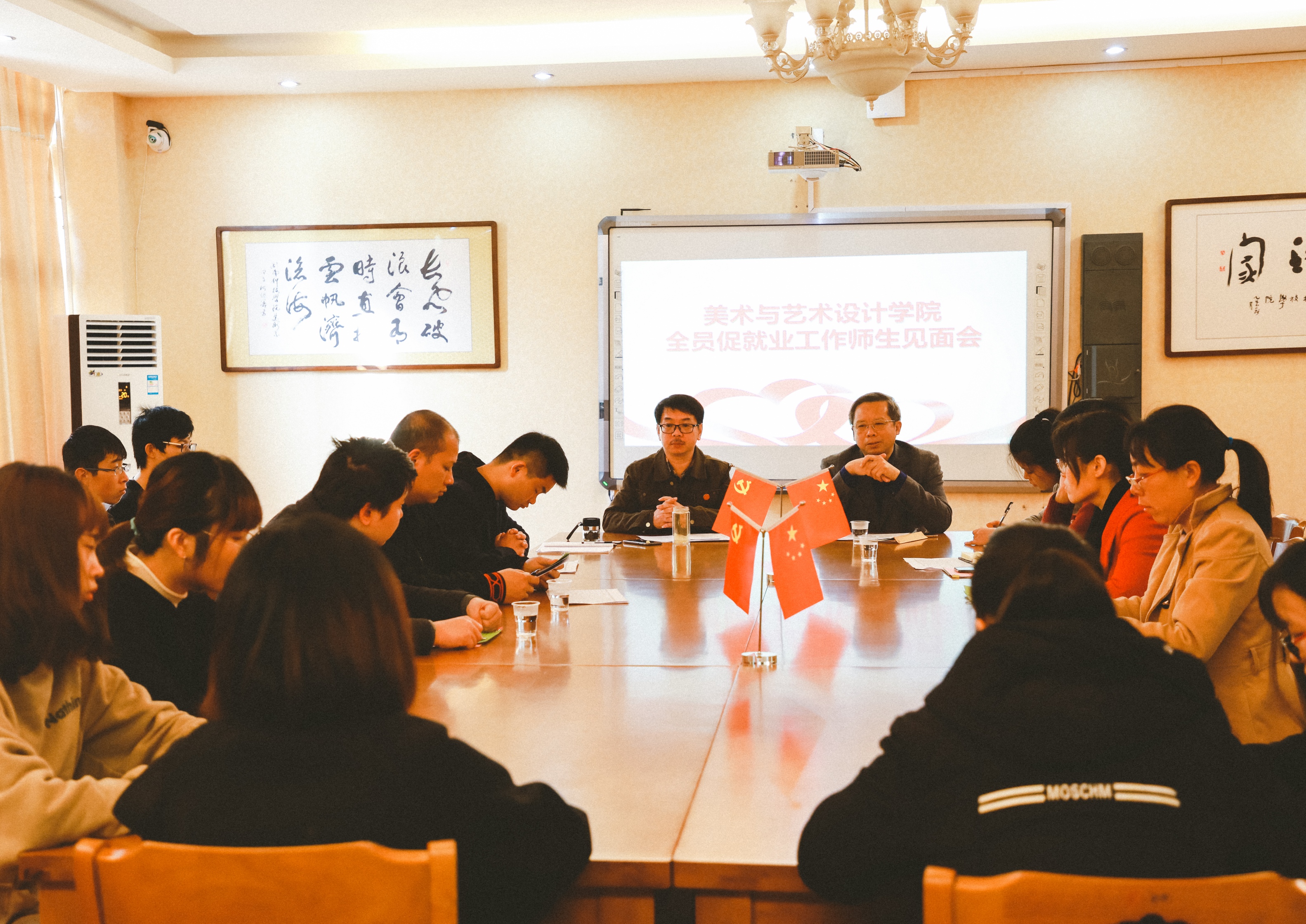 本网讯 11月28日上午,美术与艺术设计学院在美术楼南楼202会议室召开本年度全员促就业工作师生见面会。副校长郑山明、美术学院院长张建利以及全体全员促就业指导老师、学生代表参加了会议。