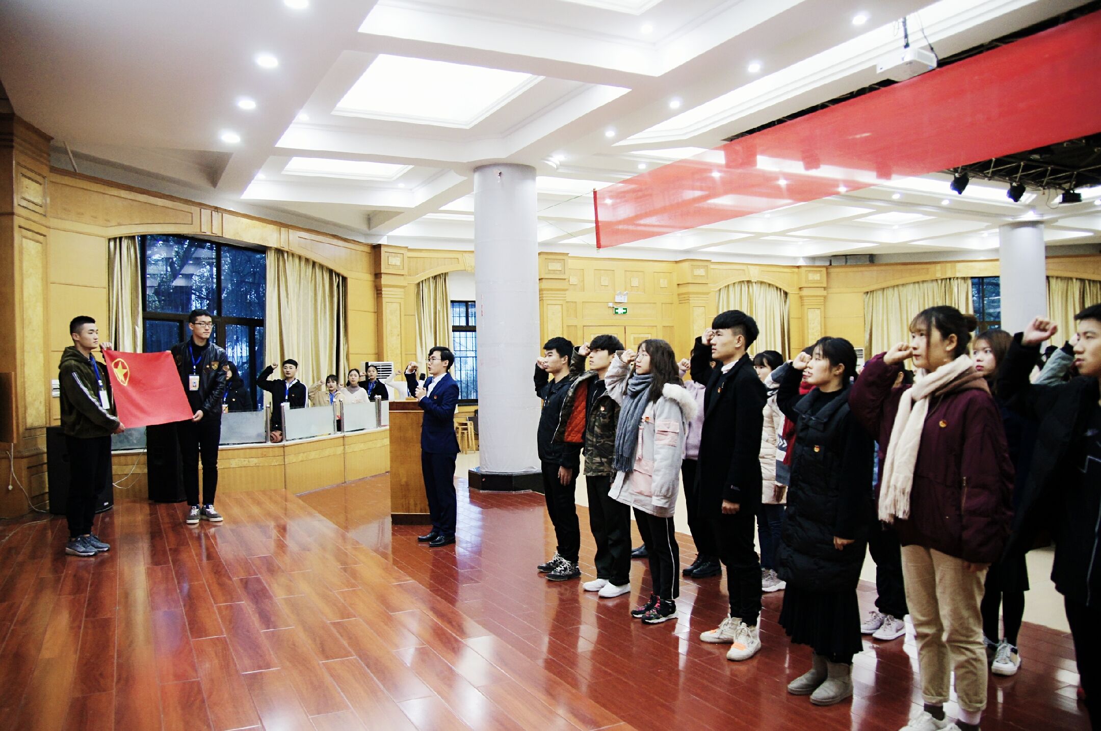 会上,校团委书记刘佳宣读关于成立华体会官方版网站登录入口学生社团联合会团总支以及大学生外语协会、党建协会、习近平新时代中国特色社会主义思想研究与实践协会等13个社团团支部的决定。程智开、刘佳为新成立的团总支和社团团支部授团旗,校学生社团联合会团总支书记陈鑫作为领誓人,带领全体与会人员重温入团誓词。