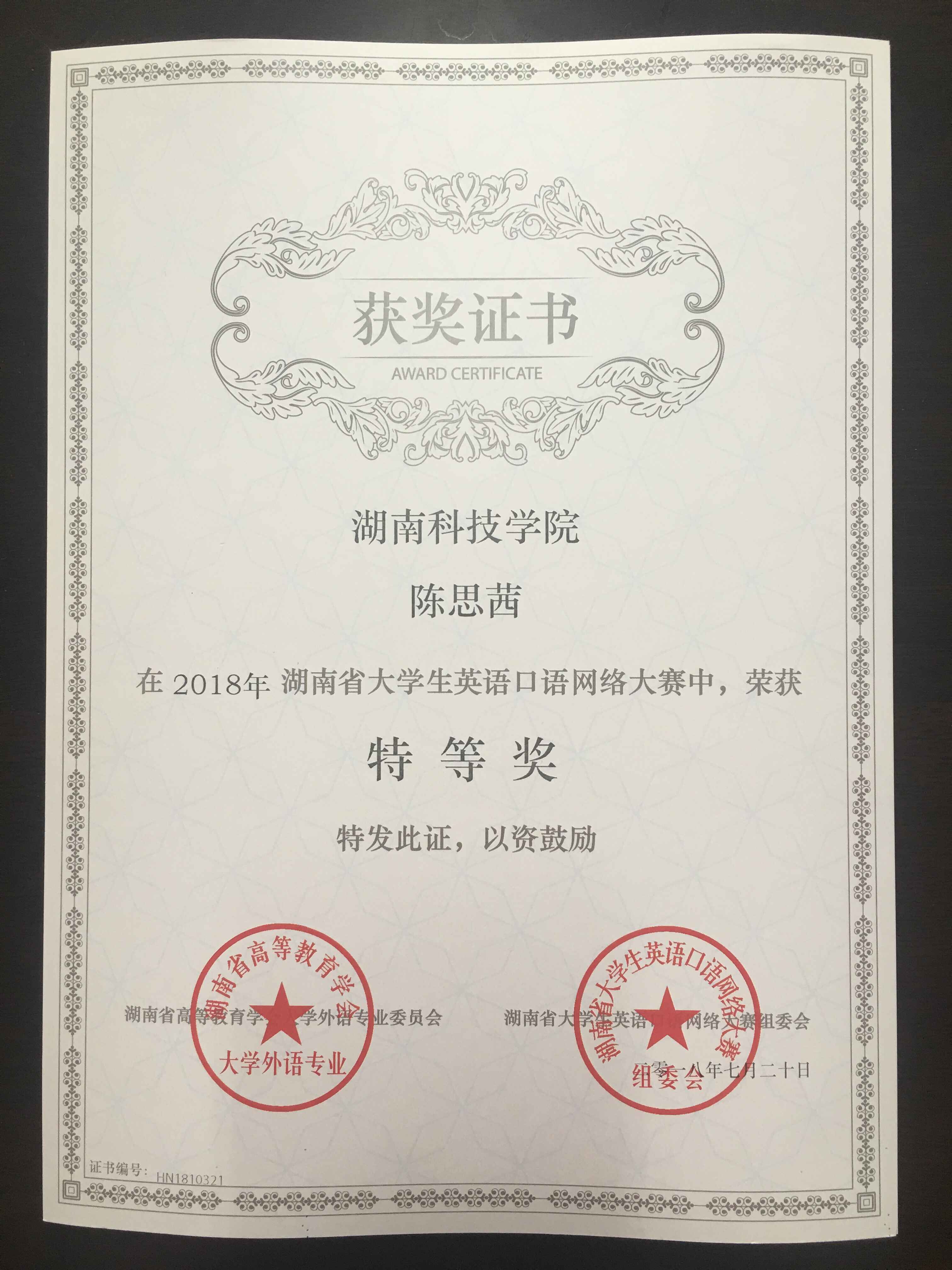 本网讯 在湖南省首届英语口语网络大赛中,我校英语1504班陈思茜从决赛选手中脱颖而出,以第二名的成绩获得省特等奖。据悉,本次决赛共有来自全省三十九所高校的一百多名选手参加。 陈思茜同学非常刻苦,每天坚持在“FIF口语训练”APP上挑战时长为8分钟的赛题,一次次地刷新自己的记录,经200多分钟的反复挑战,最终获得97分的高分,荣获省特等奖。