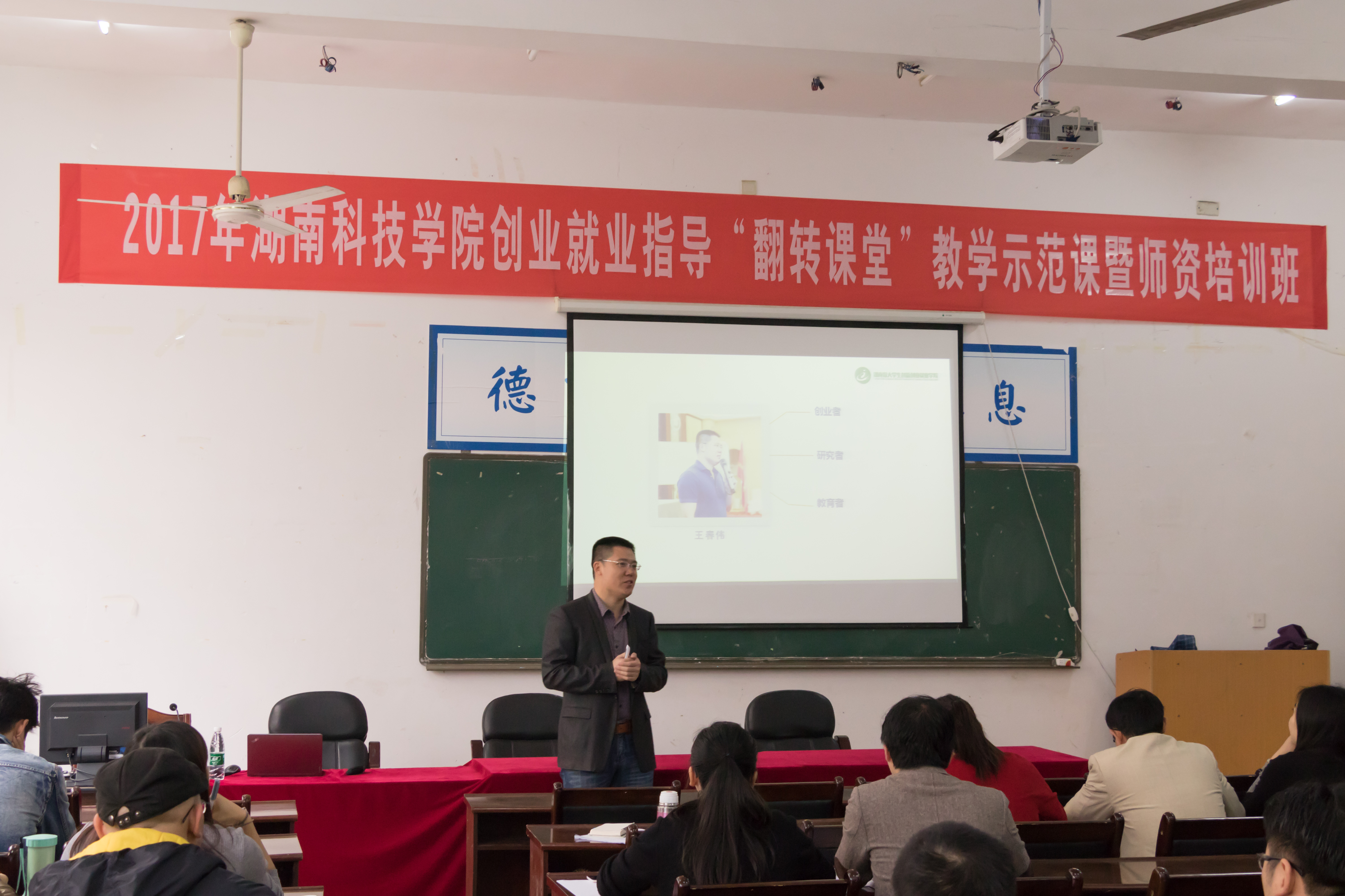 本网讯  为加快推进学校创业就业指导师资队伍建设,进一步推进创业就业指导课程教学改革,近日,创新创业学院举办创业就业指导“翻转课堂”师资培训班,创业就业指导教研室35名教师参加了此次培训。全国大学生创新创业实践联盟副秘书长、乐易考教育科技集团双创学院院长王春伟主讲,就业创业指导中心主任郑银芳主持。