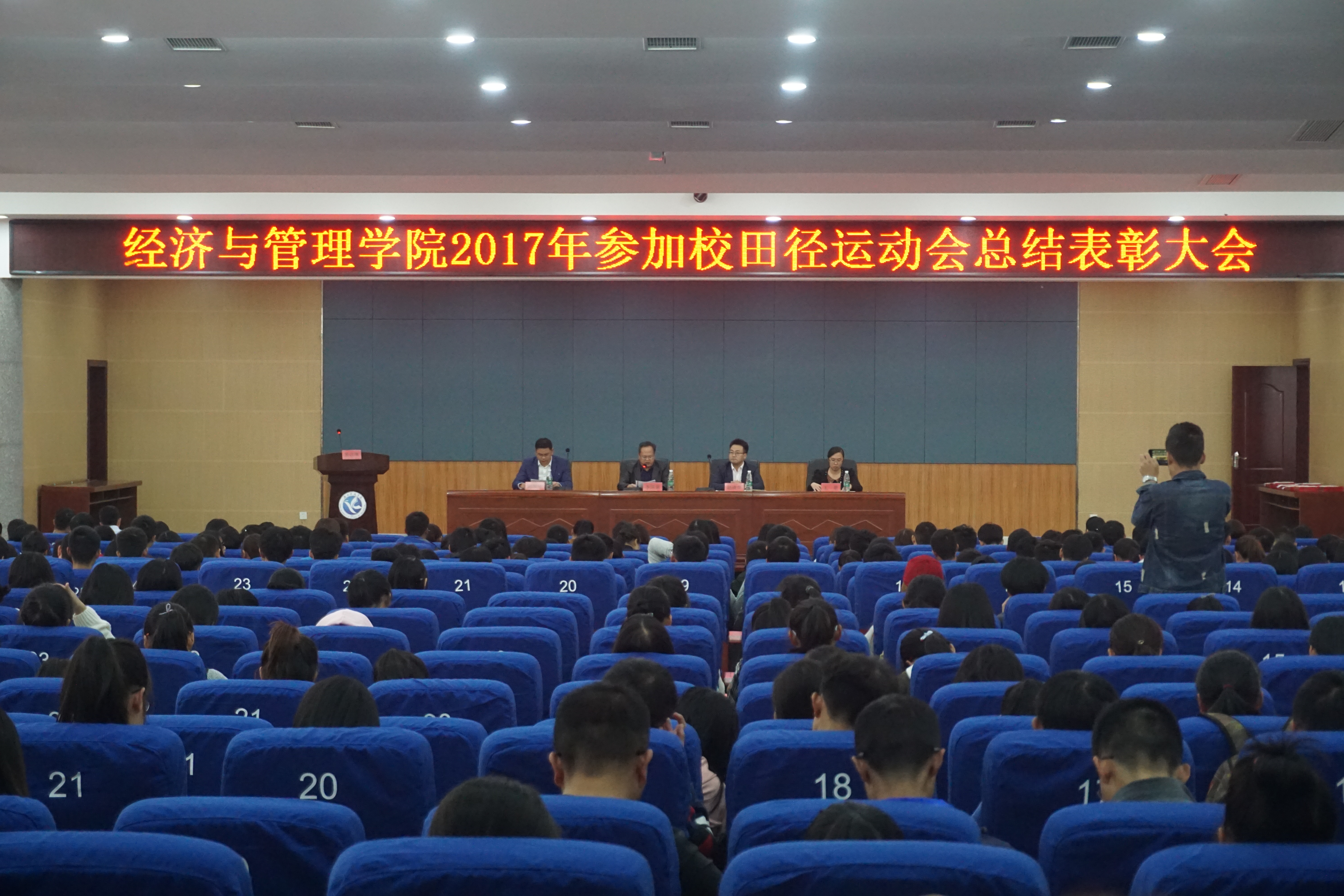 本网讯 10月31日下午,经济与管理学院在潇湘大讲堂举行2017年参加学校第十二届田径运动会的总结表彰大会,表彰了优秀运动员、特别贡献者、优秀组织者和优秀志愿者。该院院长李清泉,党总支书记胡清华以及2017级学生和学生干部参加了会议。