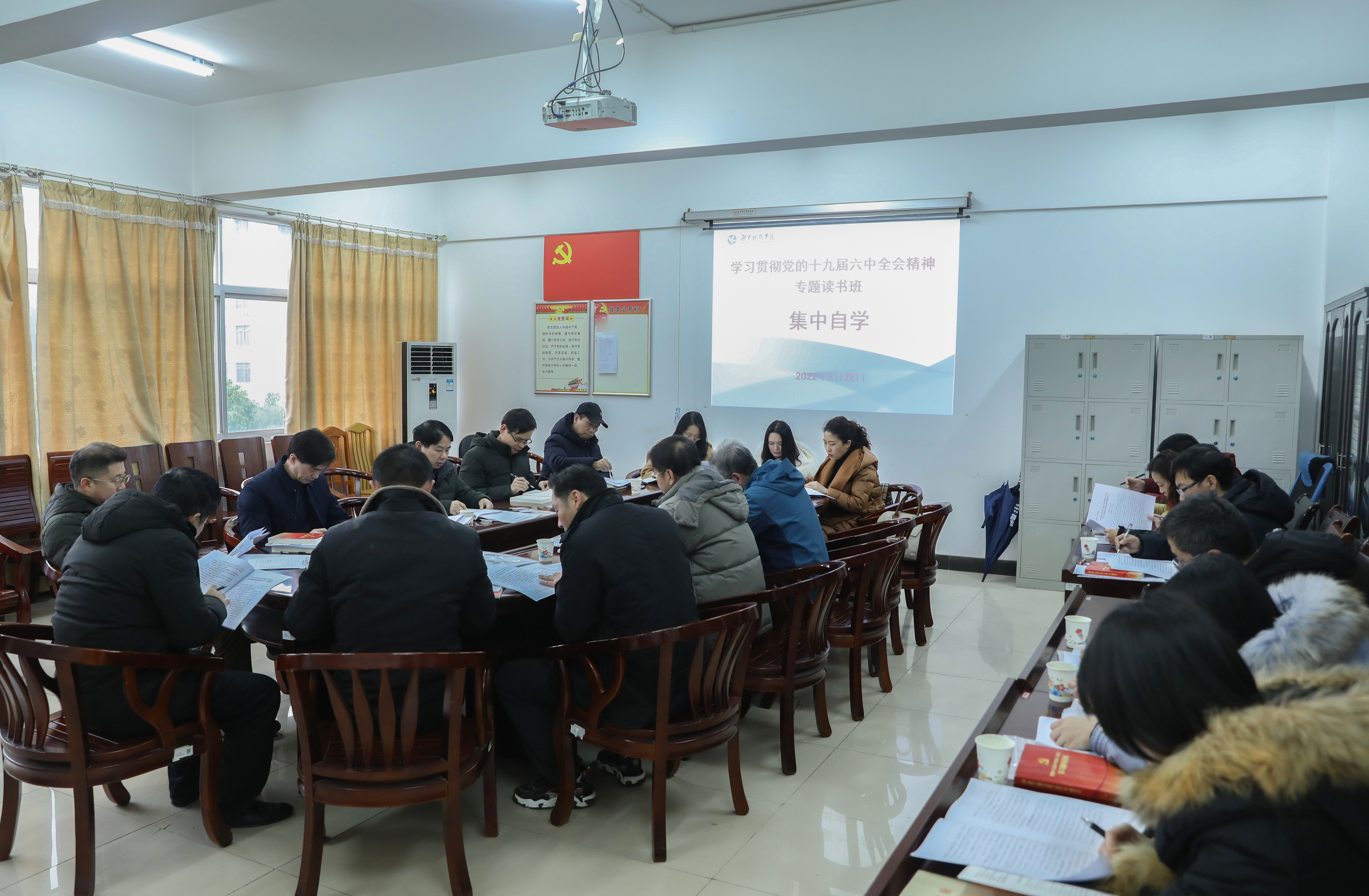 本网讯 2月22日下午,校领导及中层干部学习贯彻党的十九届六中全会精神专题读书班开班,党员干部分组开展集中自学,读原著、学原文、悟原理,原原本本学、原汁原味学,全校上下迅速兴起学习宣传贯彻全会精神的热潮。