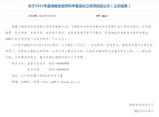 关于2022年度湖南省自然科学基金拟立项项目文件