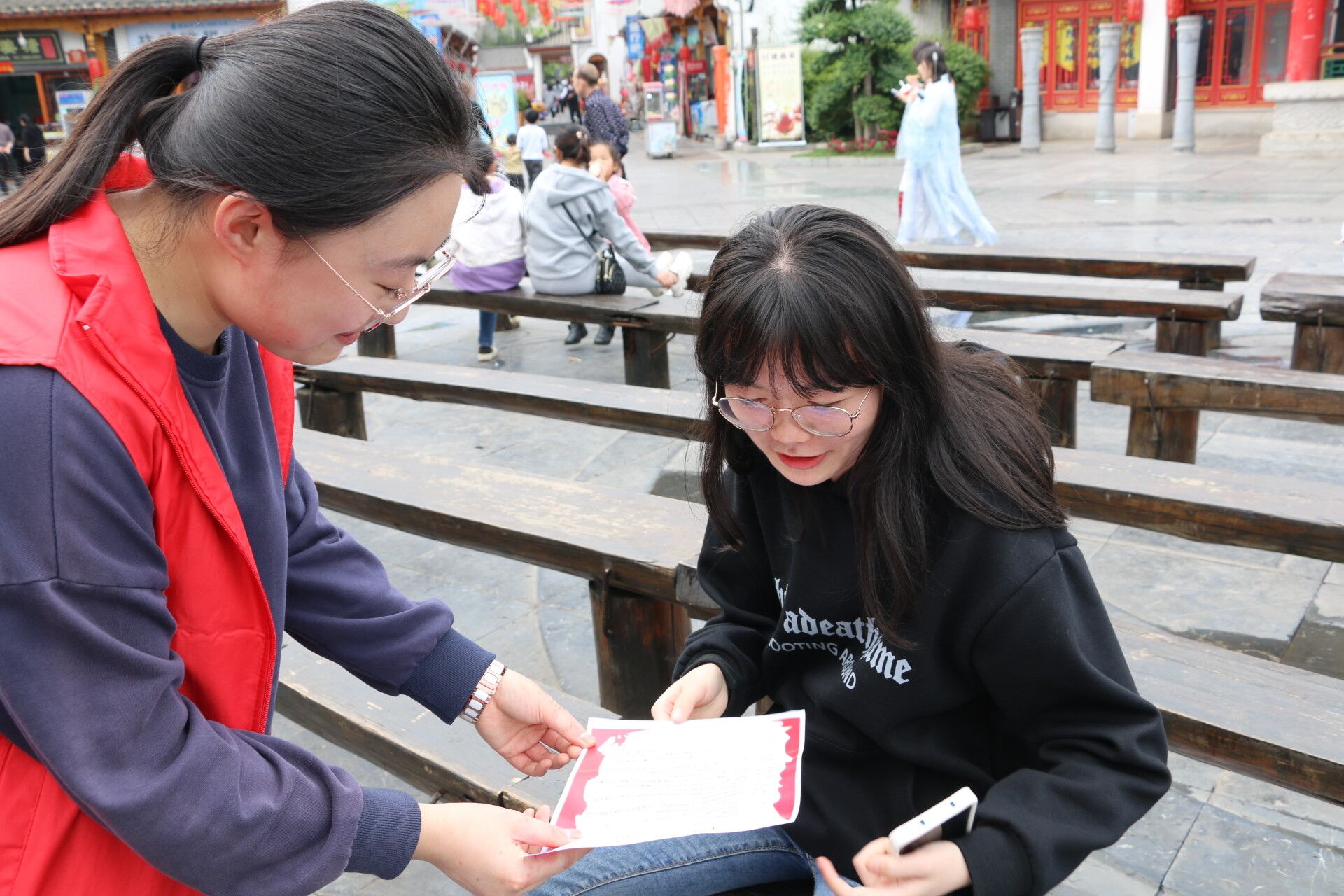阳光正好,微风不燥,志愿者以饱满的精神状态投身于宣传活动中,他们带上自己制造的古建筑模型,奔走于各个街道,为游客与当地居民发放消防宣传手册,在耐心讲解防火知识的同时,鼓励大家保护古建筑璀璨的文化,并为之贡献自己的力量。“文物古建筑是国家重要的历史文化遗产,是国家文明的重要标志,我们每个人都有义务去保护它们。”游客对志愿者们的宣传活动表示肯定与赞扬。