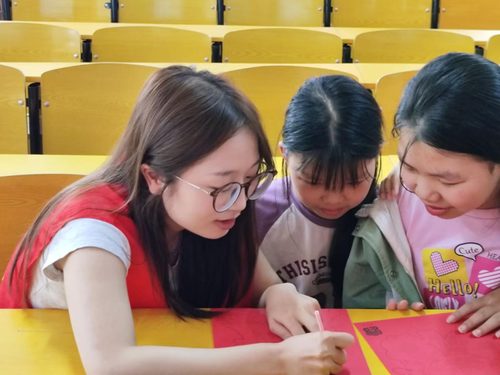 随后,志愿者们和南津渡小学的孩子们一起用刻刀细心地雕刻着剪纸,在雕刻的同时志愿者也向同学们介绍剪纸的内容和含义。在交流中有的孩子在心里暗下记下,有的孩子用稚嫩的声音说“我以后要当警察抓坏人,保护大家。”