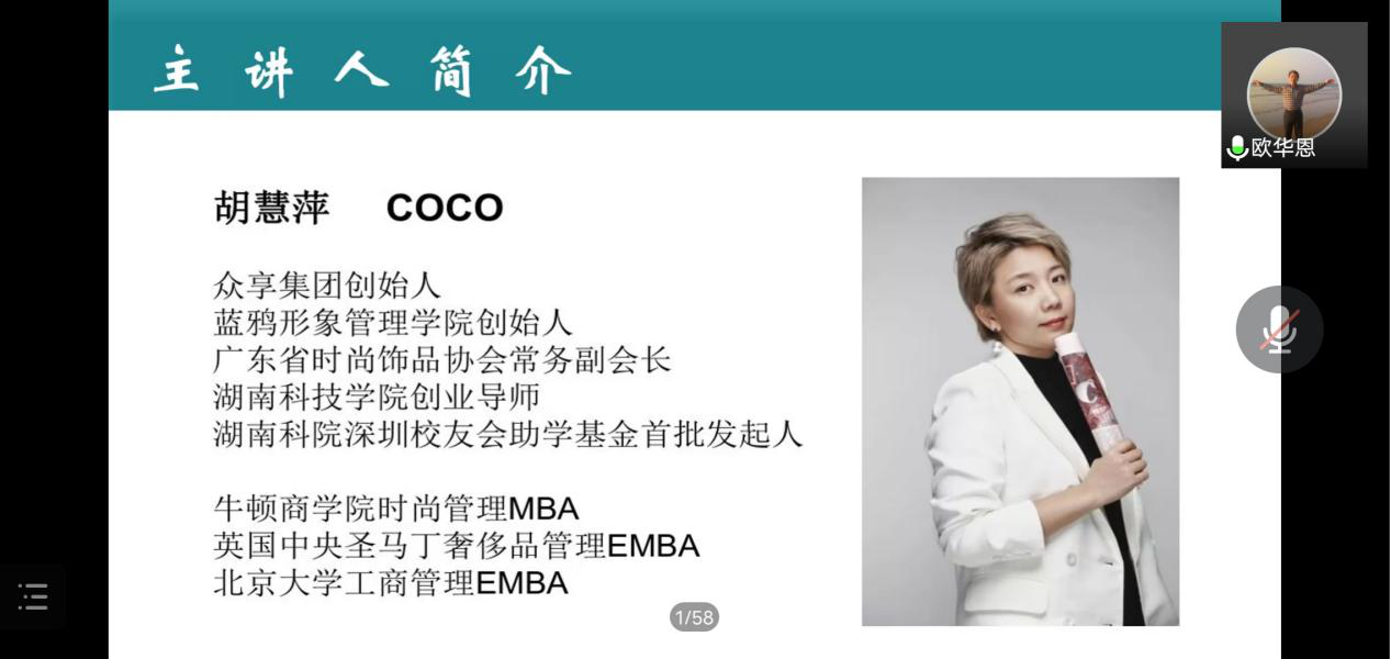 本网讯(通讯员 江敏)1月27日下午2:00,外国语学院于腾讯会议APP线上举办了以“感恩立志,笃行分享”为主题的第八期“校友说创业”活动。外国语学院院长欧华恩,团总支书记刘罗应邀参与此次活动。本期活动的主讲人是1999届优秀校友胡慧萍(众享集团创始人、蓝鸦形象管理学院创始人、广东省时尚饰品协会常务副会长)。全院共有200余人主动报名参与此次活动。