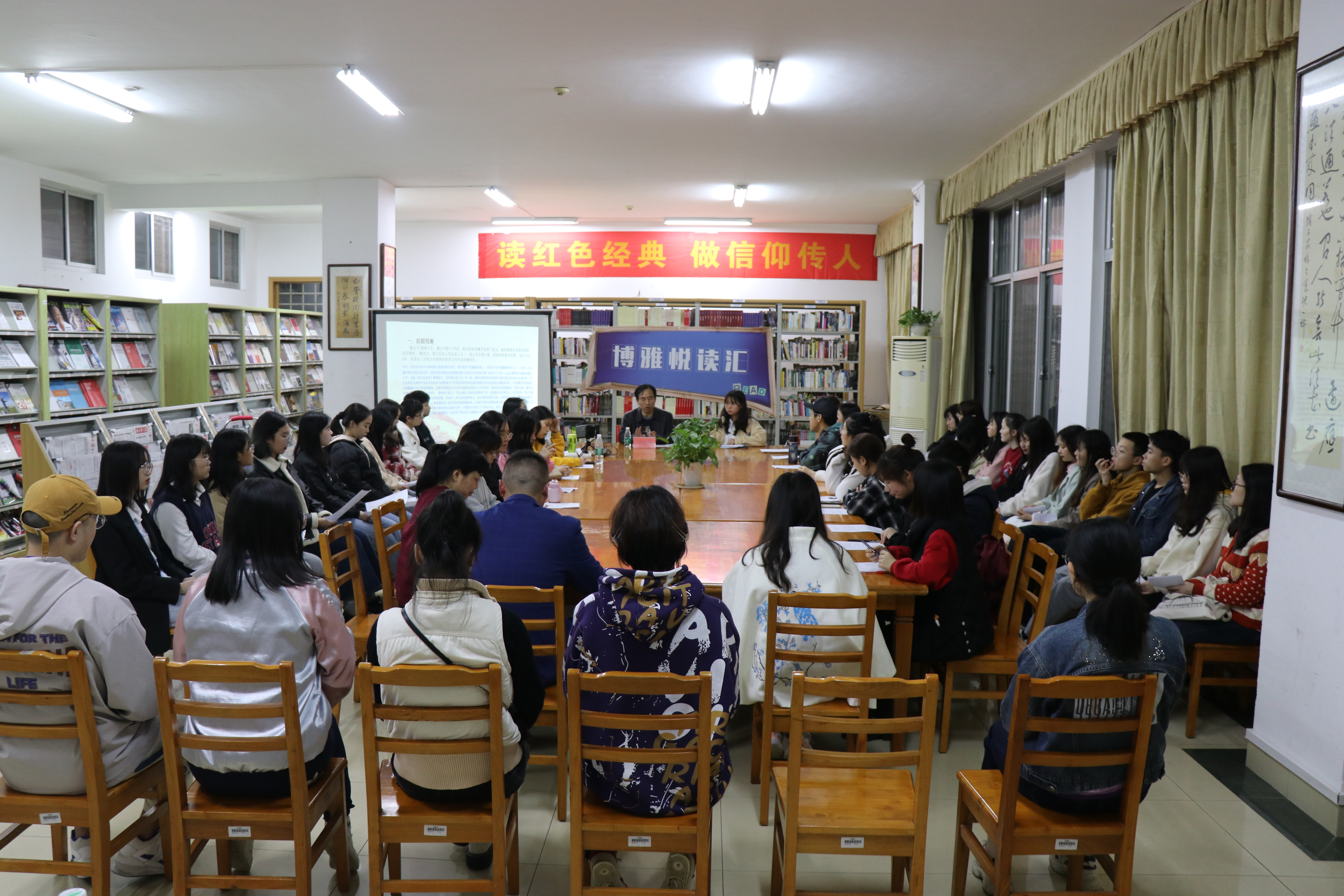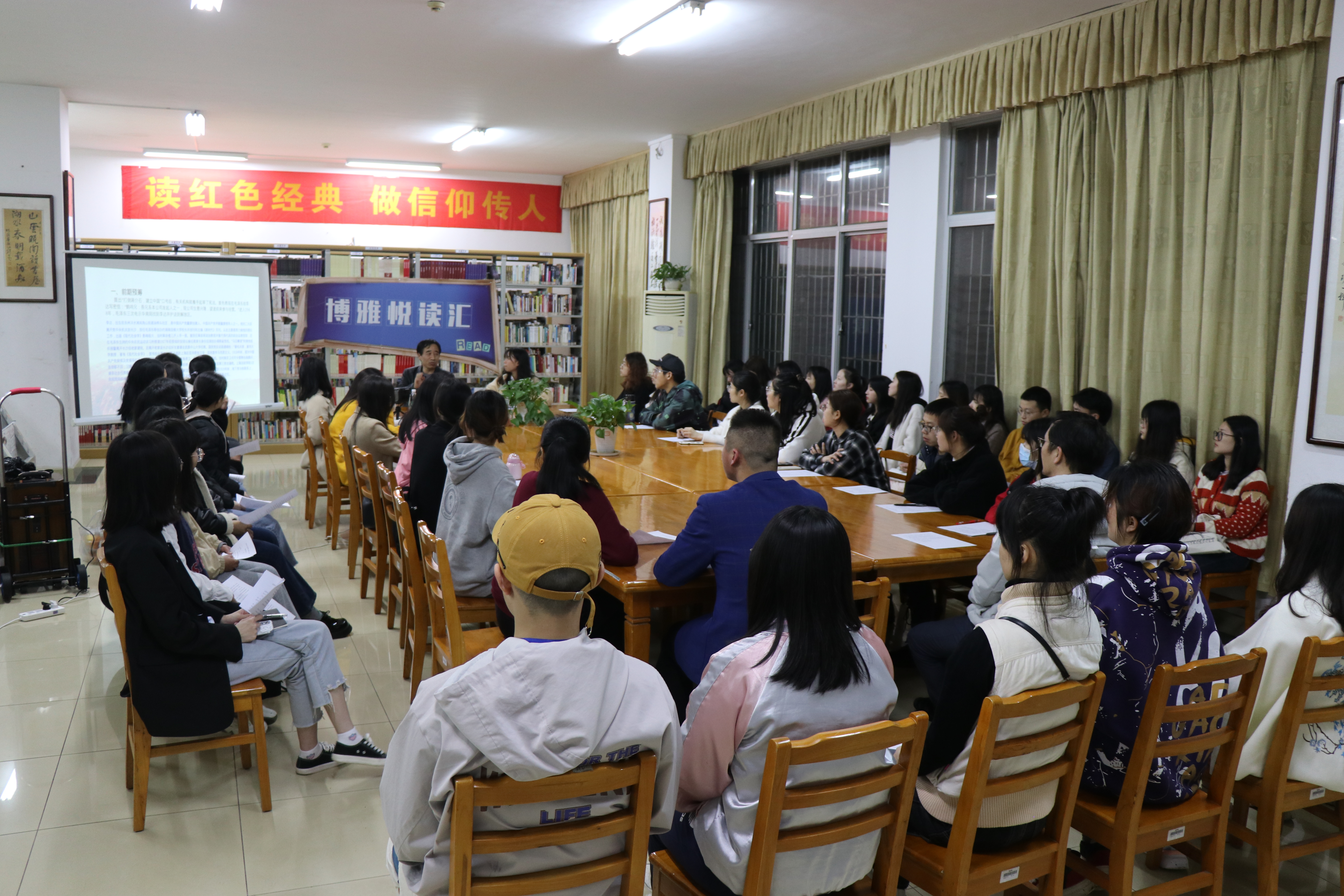 本网讯(通讯员 陈奕君 摄影 谭星宇)为大力弘扬党的优良传统和作风,从党的百年伟大奋斗历程中汲取继续前进的智慧和力量,416日晚700,外国语学院与学校图书馆共同举办的博雅悦读汇学四史专题——第二期学新中国史读书沙龙在新图书馆104综合阅览室顺利开展。本期活动由马克思主义学院柏春林教授为我们分享经典《在庆祝中华人民共和国成立70周年大会上的讲话》。图书馆副馆长杨沫辉、地方文献部主任吴翠云、外国语学院团委书记刘罗及40名青年学生共同参加此次活动。