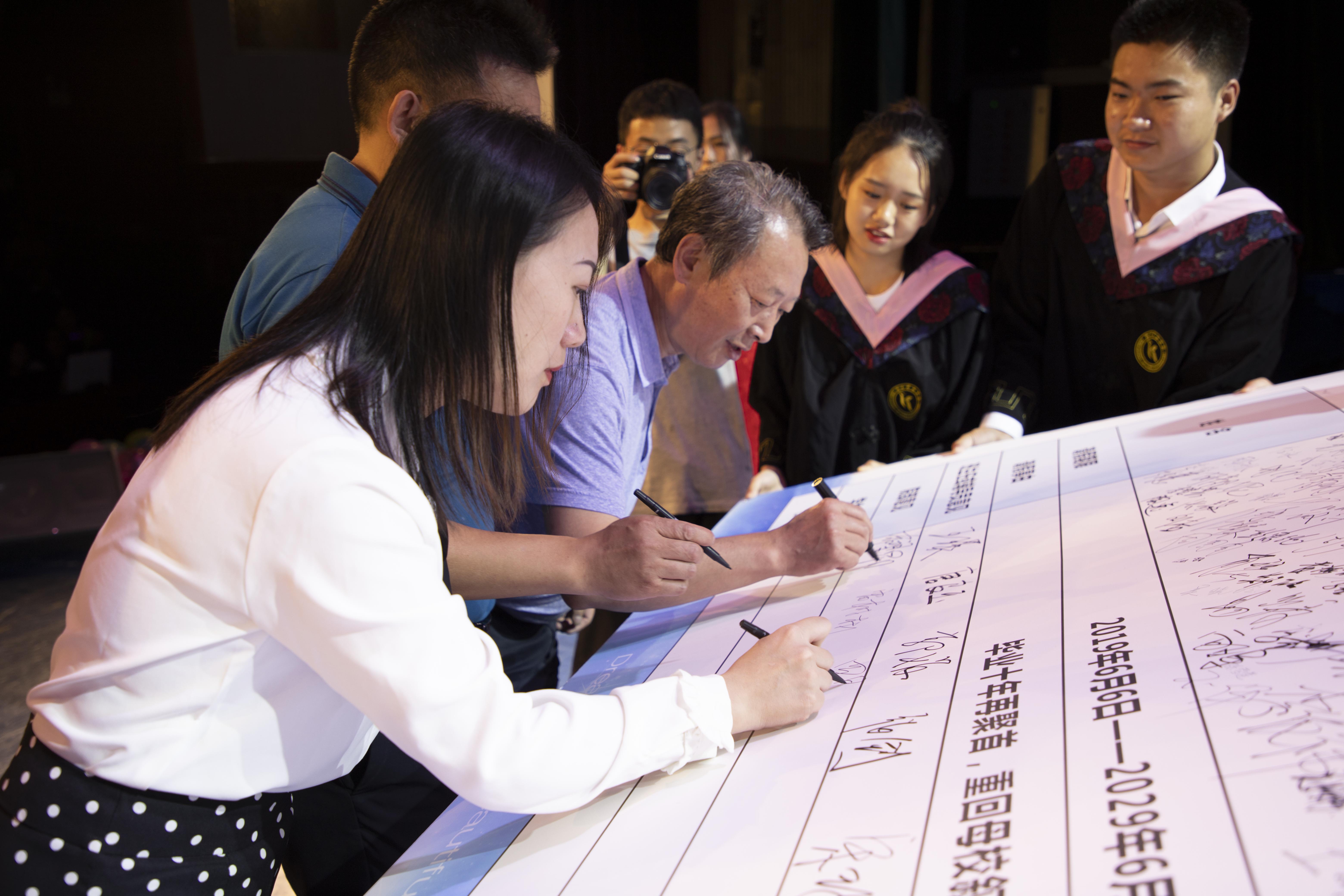 最后,领导、老师们为毕业生签批了一张期限为十年的请假条毕业十年再聚首,重回母校叙情谊。