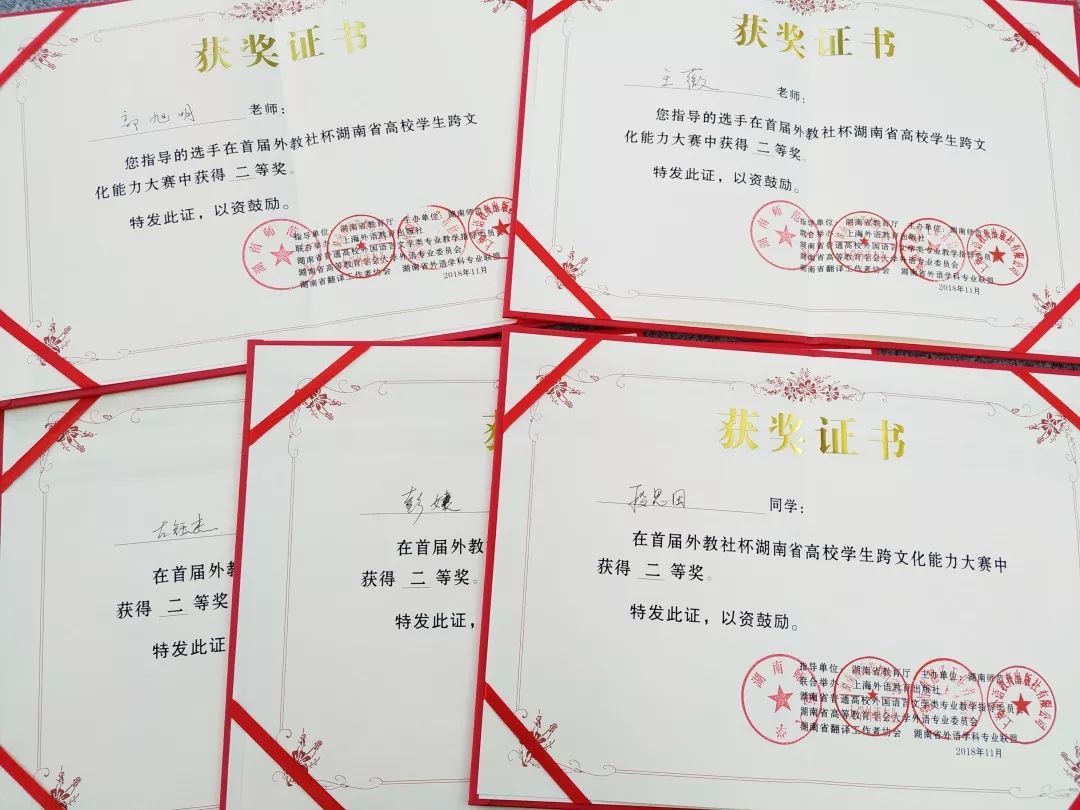 本网讯(通讯员 王薇)11月25日,第一届“外教社杯”湖南省高校学生跨文化能力大赛在湖南师范大学落下帷幕,我校英语1603班彭婕同学,汉文1603班段思田同学和国贸1602班左钰杰同学组成的团队从激烈的竞争中脱颖而出,荣获二等奖。