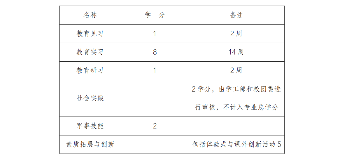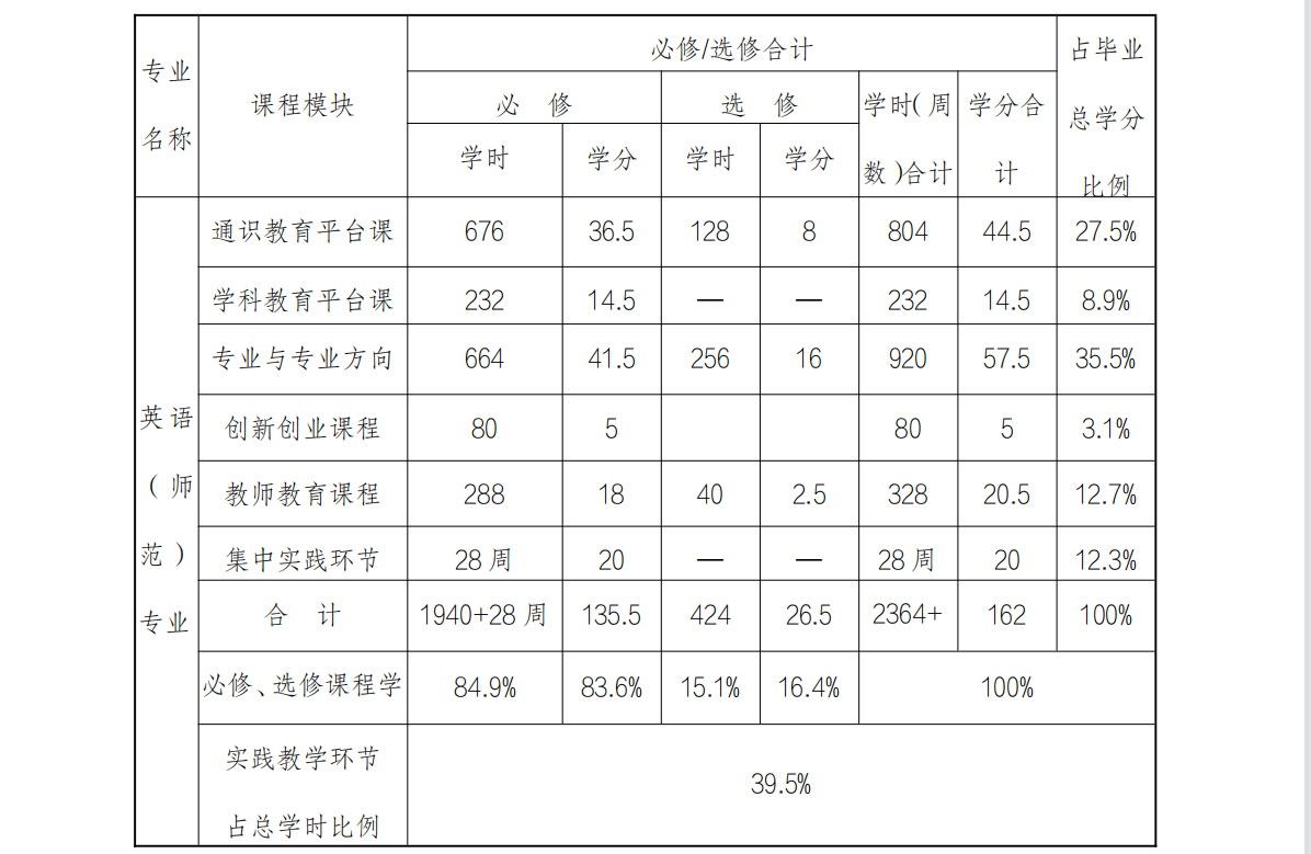 本专业学生在校期间,必须修满本方案规定的 162 学分,否则不予毕 业。其中: 必修课程 135.5 学分,包括:通识必修课程 36.5 学分、学科基础课程 14.5 学分、专业核心课程 41.5 学分、创新创业课程 5 学分、教师教育课程 18 学分(师范类专业)、集中实践环节 20 学分。 选修课程 26.5 学分,包括:通识选修课程 8 学分、专业选修课程 16 学分、教师教育课程 2.5 学分(师范类专业)。 修满学分,达到一定条件,符合学位授予的相关规定,授予文学学士 学位。