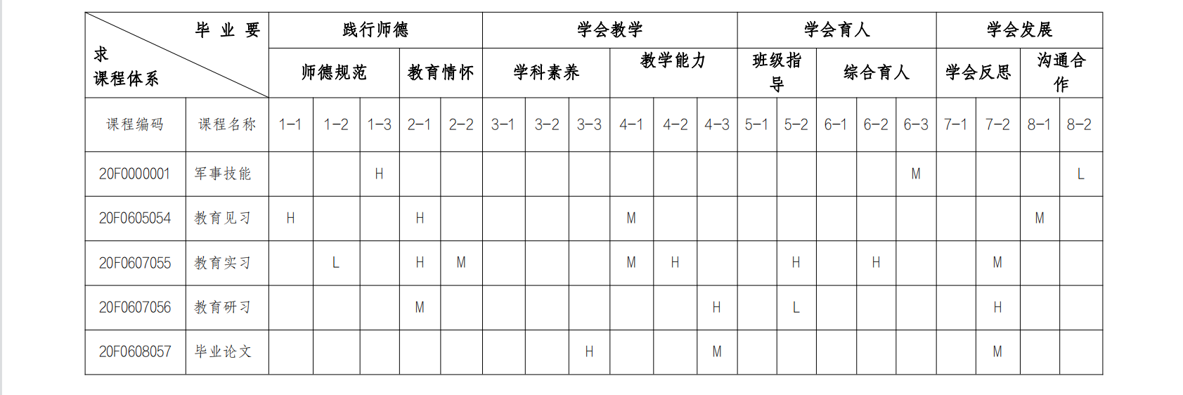 注:根据毕业要求与课程目标、课程内容与课程目标的对应关系编制本表,“课程体系支撑毕业要求实现关系矩阵”应覆盖所有 必修环节,开设各课程(理论课程、实践课程)应对毕业要求达成具有一定支撑作用。根据课程对各项毕业要求的支撑强度分别用“H (高)、M(中)、L(弱)”表示,支撑强度的含义是:该课程覆盖毕业要求指标点的多寡,H 至少覆盖 80%,M 至少覆盖 50%,L 至 少覆盖 30%。不必全部支撑,不可能全部支撑,须明确高支撑。