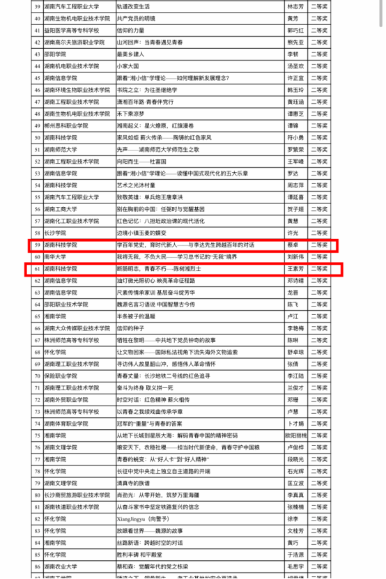 (通讯员 蔡卓)近日,第二届湖南省高校“青春学习堂”短视频大赛评选结果揭晓。我院蔡卓老师的作品《学百年党史,育时代新人——与李达先生跨越百年的对话》和王素芳老师的作品《断肠明志,青春不朽——陈树湘烈士》双双荣获大赛二等奖,充分展现了我院教师在创新思政育人、讲好中国故事方面的优秀成果。
