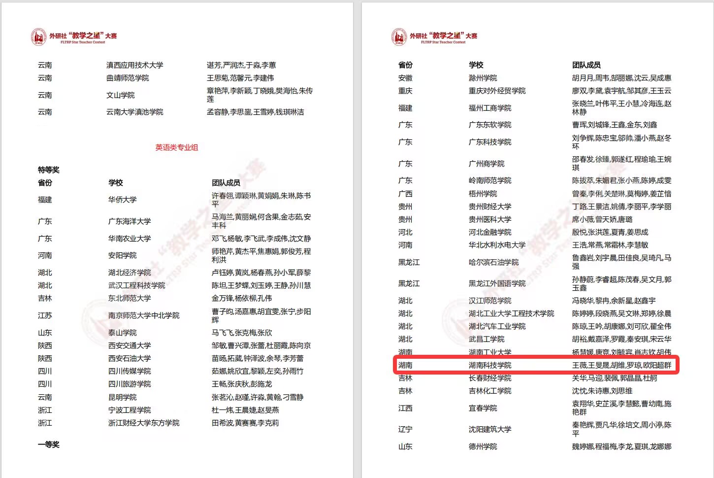 本网讯(通讯员 王旻晟,胡维)在近日揭晓的2025年外研社“教学之星”大赛全国复赛结果中,我院王薇教学团队(组员包括王旻晟、胡维、罗琼、欧阳超群)成功斩获全国复赛一等奖。