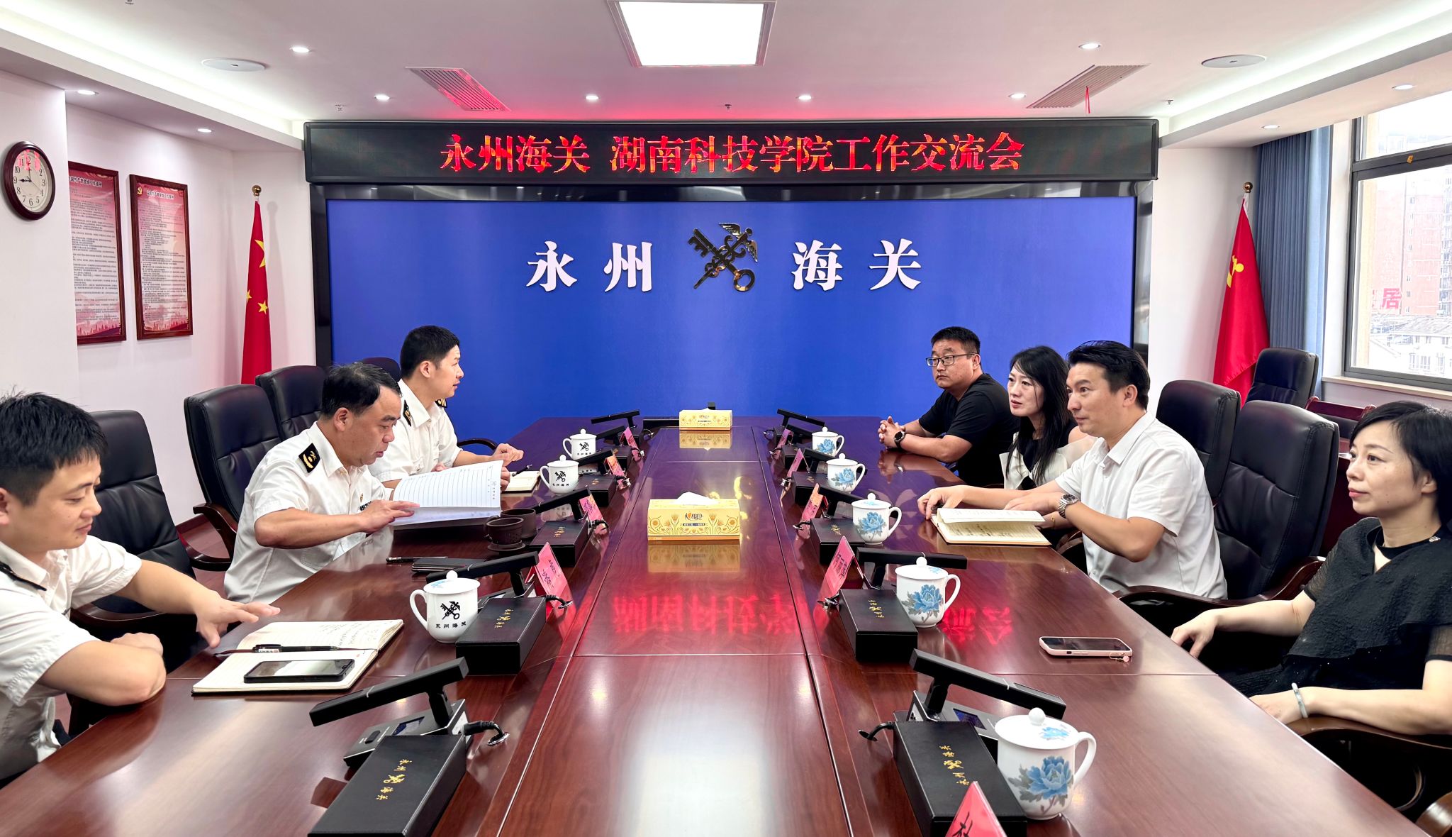 在永州海关,唐君介绍了学院的基本情况,表达了交流合作意向。何丽萍表示,学院人才培养目标中重要一项就是服务地方社会经济发展,同时介绍了学院在语言服务、文化传播等方面的特色亮点。邓萍芳关长介绍了永州海关的基本情况。双方就交流合作领域的具体工作进行了探讨。