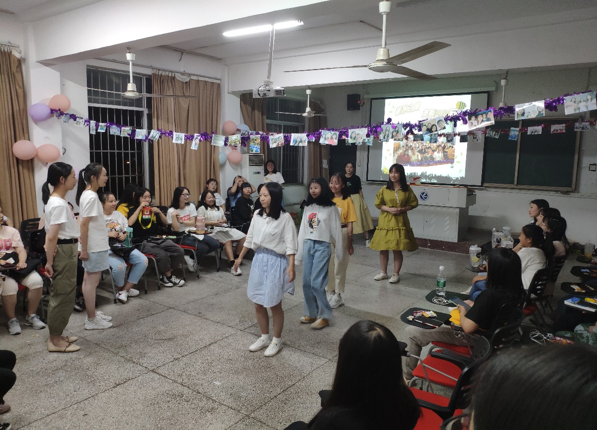 与此同时,各班级在本次活动中都加入了极具本班特色的小游戏。如:日语1902班的“你画我猜”游戏让活动达到高潮,每位同学都积极参与,在游戏的同时增加了默契,整个场地充满了欢声笑语;商务英语1902班的“甜心”游戏,让同学们把糖送给他们想送的人,并说出所欣赏的一个品质或理由,让同学们学会欣赏人的优点和特长,学会表达自己的情感此外“贴墙”游戏也让每位同学都欢跃起来,英语师范1902班副班和朋辈也参与到了游戏中,增加了同学之间的亲密度,其乐融融。活动当天恰好有同学过生日,全班同学合唱生日歌,纷纷送上生日祝福,场面十分温馨,刚进大学便和全班同学一起过生日,相信这一定是最难忘的生日。