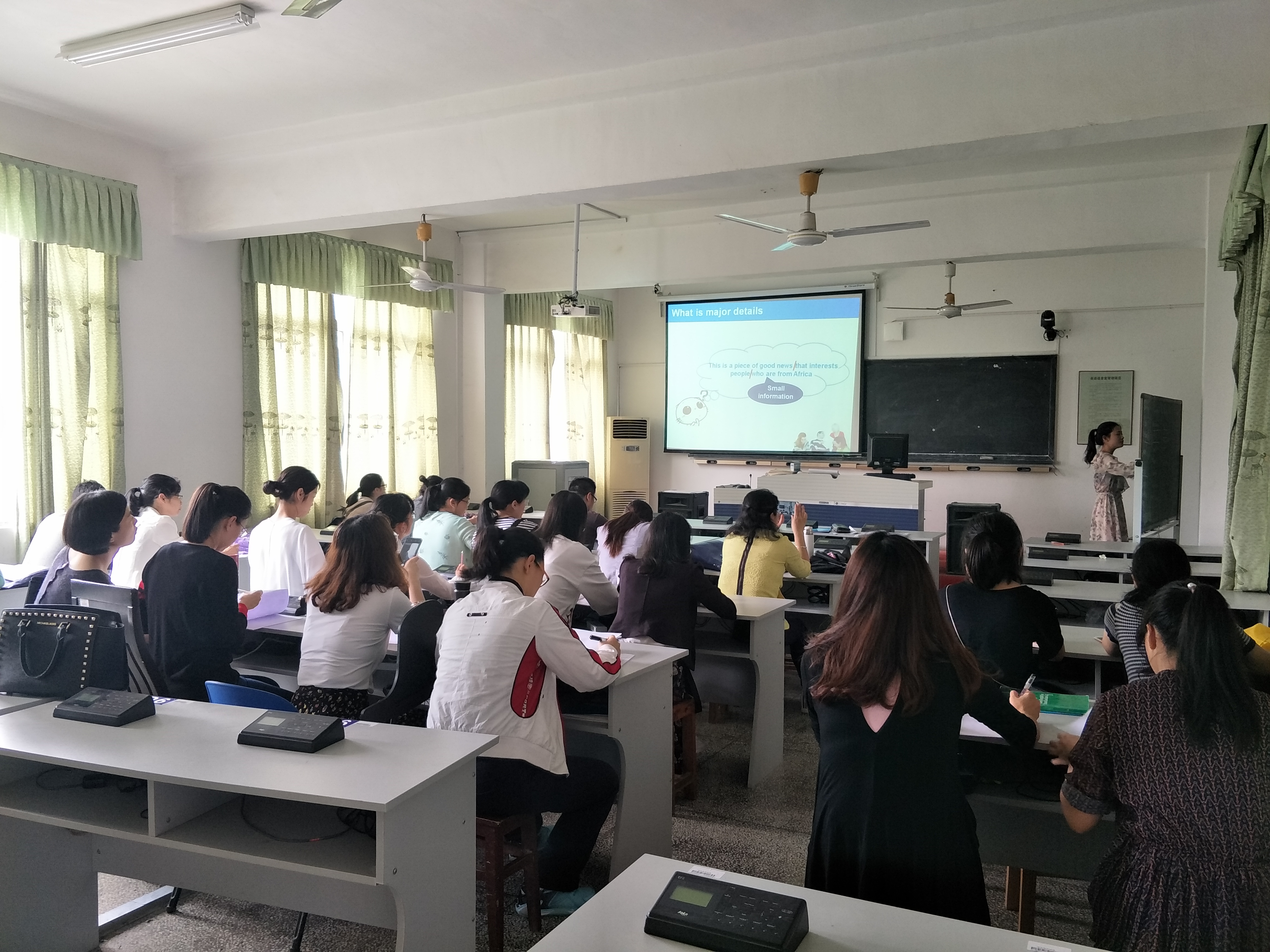 实习教师唐青青给外国语学院公共英语教学部的全体教师上了一堂15分钟的公开课。唐老师围绕“阅读主要细节”这一技巧展开教学设计,主要讲授了“什么是主要细节”、“如何阅读主要细节”、“如何撰写主要细节”三个部分。整体教学过程流畅、自然,基本达到了教学目标。