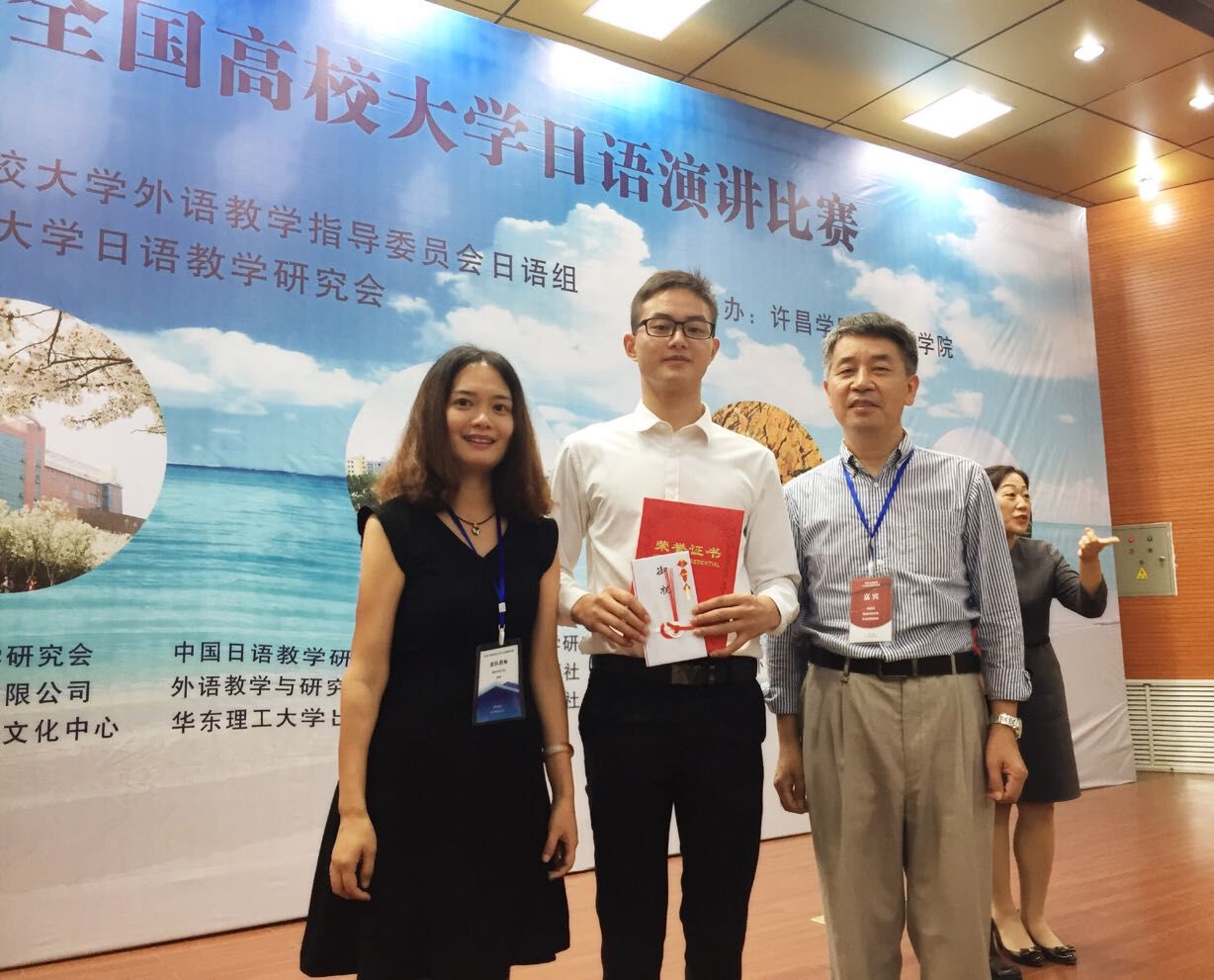(通讯员 张剑)9月23日,由教育部高校大学外语教学指导委员会日语组和高等学校大学日语教学研究会联合主办的“首届全国高校大学日语演讲比赛”在许昌学院举行。经过激烈角逐,我院英语专业15级学生彭征同学荣获一等奖。