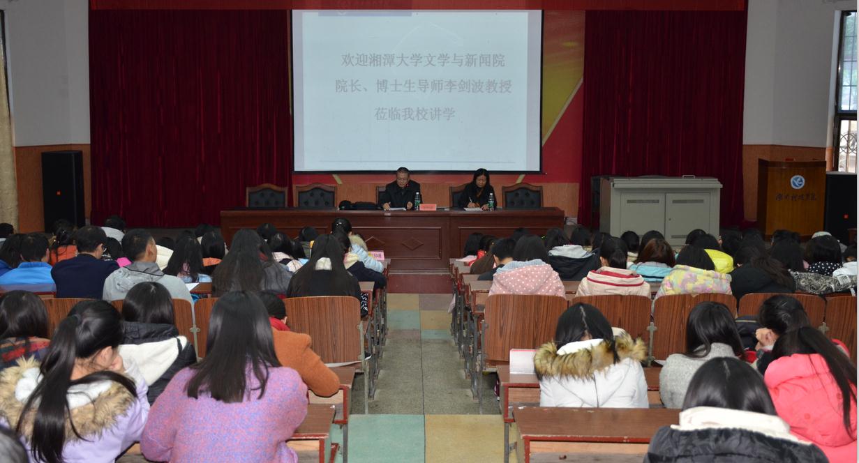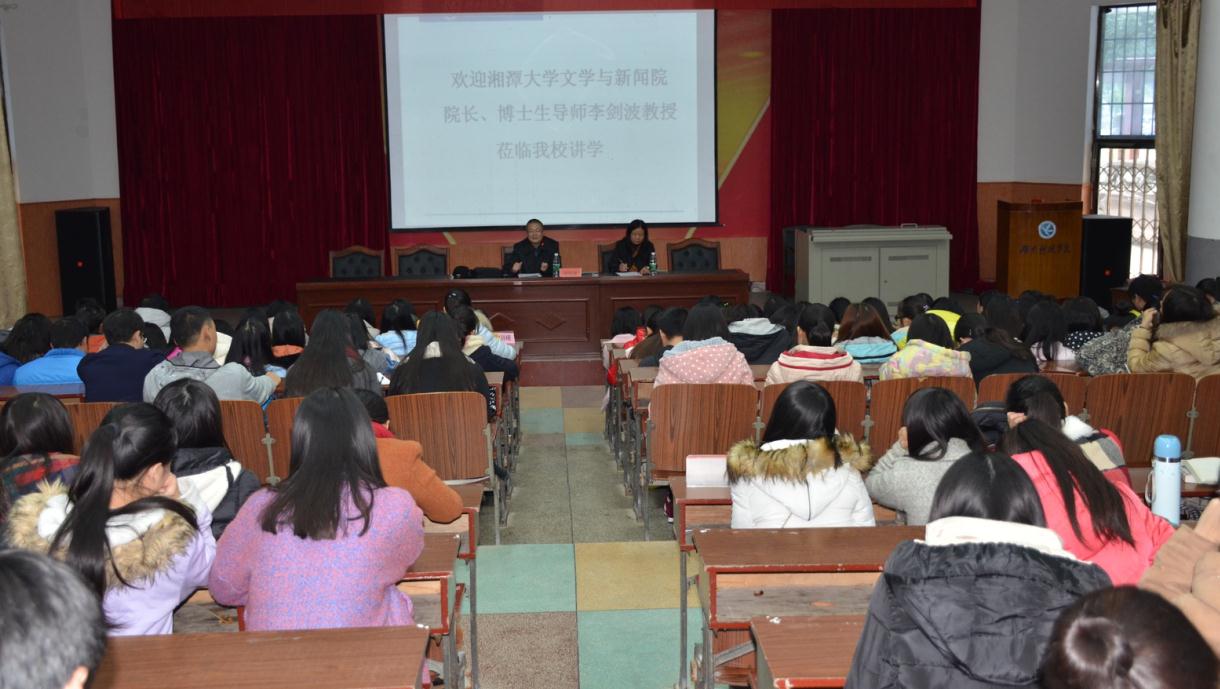 本网讯(通讯员 向赛男 陈壹丹 李雯静)11月27日下午,湘潭大学文学与新闻学院院长、博士生导师李剑波教授应邀来我校讲学,在明德楼报告厅为人文与社会科学学院师生做了一场题为“清代诗坛对宋诗范式的重建与创新”深刻而精彩的讲座。讲座由该院翟满桂教授主持。