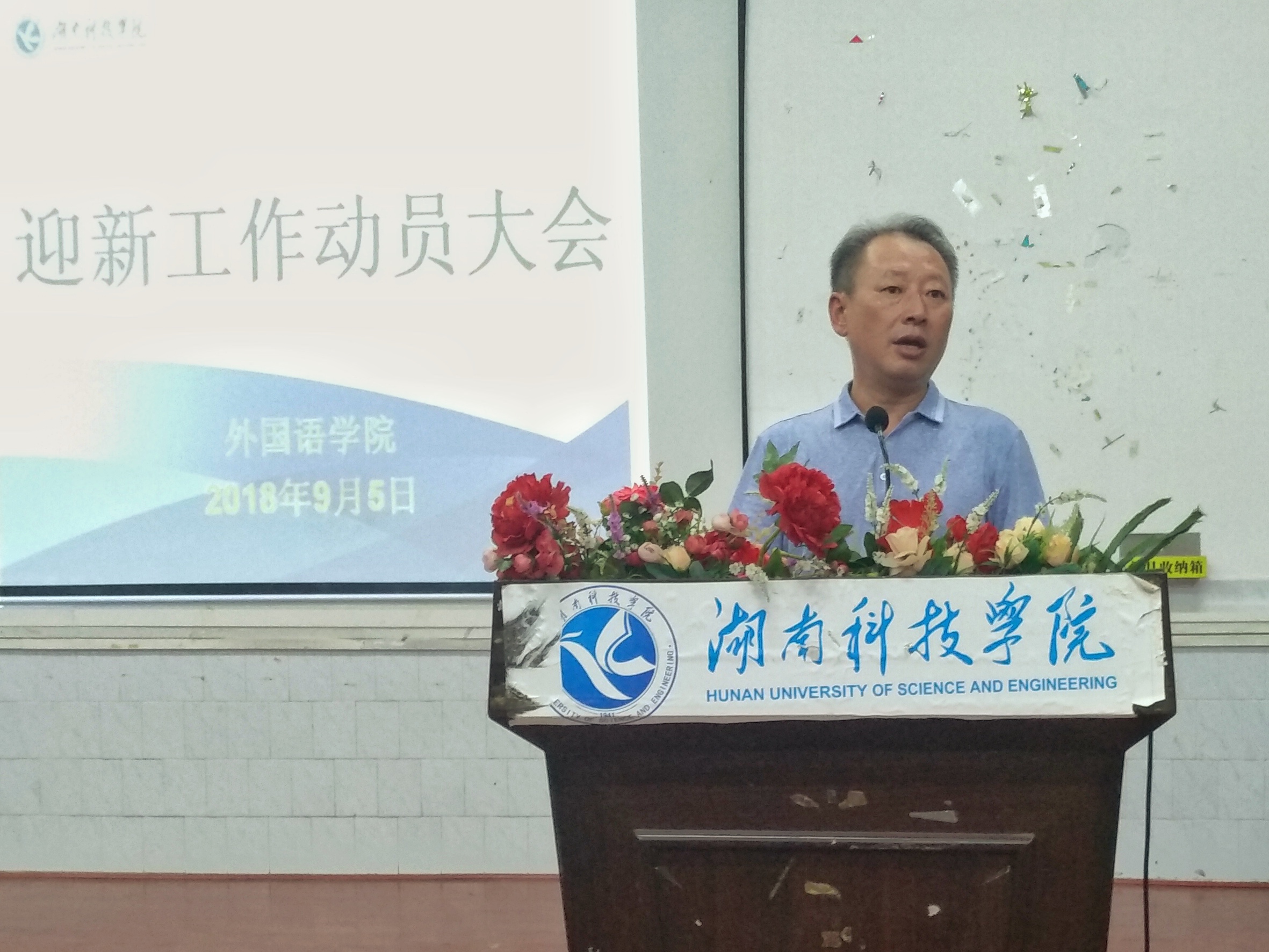 本网讯(通讯员肖敏)为确保2018年迎新工作顺利开展,为新生提供高效便捷的服务,外国语学院于9月5日晚在博雅楼东三召开迎新工作动员大会,院长欧华恩出席大会并做动员讲话,全体院领导、辅导员、新生班主任及200余名志愿者参加了会议。会议由党总支书记雷树彬主持。