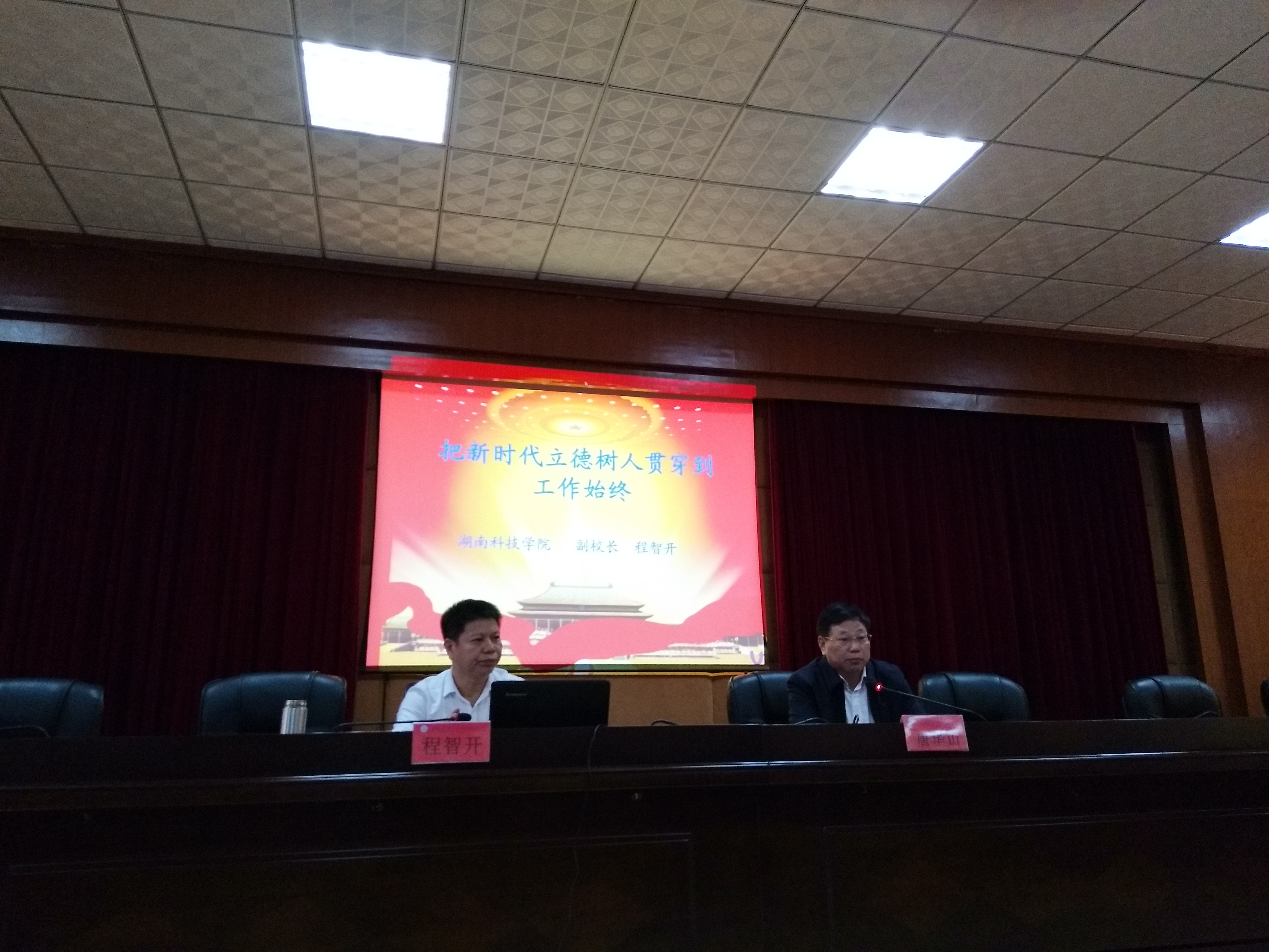 为贯彻落实习近平总书记在全国教育大会上的重要讲话精神,提升我校思想政治工作水平,着力提高新时代辅导员的素质和能力,学工部组织全体学工人员开展辅导员系列培训。9月27日下午3点,在行政楼八楼一会议室召开辅导员系列培训第一讲,讲座由学工部长唐华山主持,副校长程智开主讲,各教学学院党总支副书记、全体辅导员以及学工部相关人员参加。