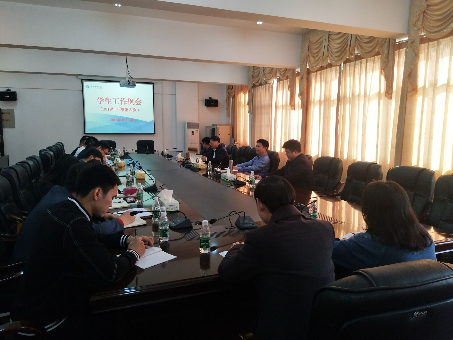 (简讯)10月30日上午8点30分,学工部组织召开了2018年下期第四次学生工作例会,会议由副校长程智开主持,副校长程智开、学工部长唐华山、保卫处处长吴春江、各教学学院党总支副书记以及学工部相关人员参加了会议。