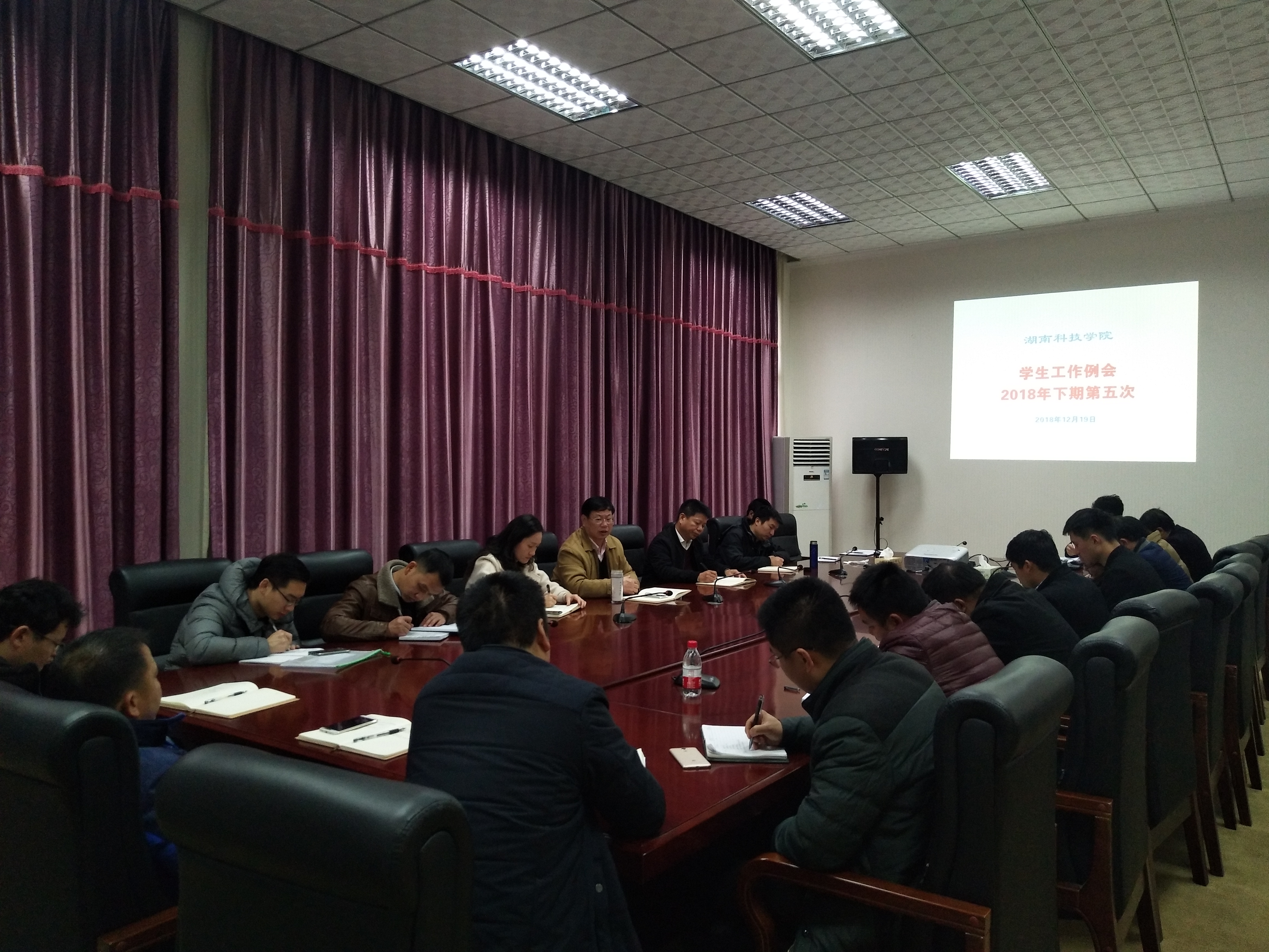 (简讯)12月19日上午10点,学工部组织召开了2018年下期第五次学生工作例会,会议由副校长程智开主持,学工部长唐华山、校团委书记刘佳、各教学学院党总支副书记以及学工部相关人员参加了会议。