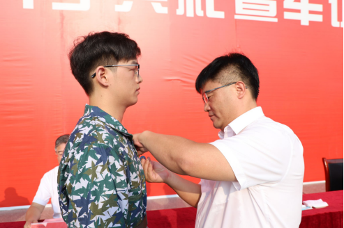 李钢为2024级新生代表佩戴校徽。