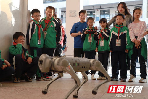 “它会动吗?”“它当然会动啦,它可是机械狗。”课后,孩子们纷纷探出好奇的小脑袋,目光聚集在这两个“不明生物”上,趴下、起立、跳舞,志愿者摆弄着机械狗做出一个个让孩子们惊叹的动作,这个课间,四年一班教室外的走廊充溢着孩子们的欢声笑语,暖色的阳光打在孩子们的笑容上显得格外好看。