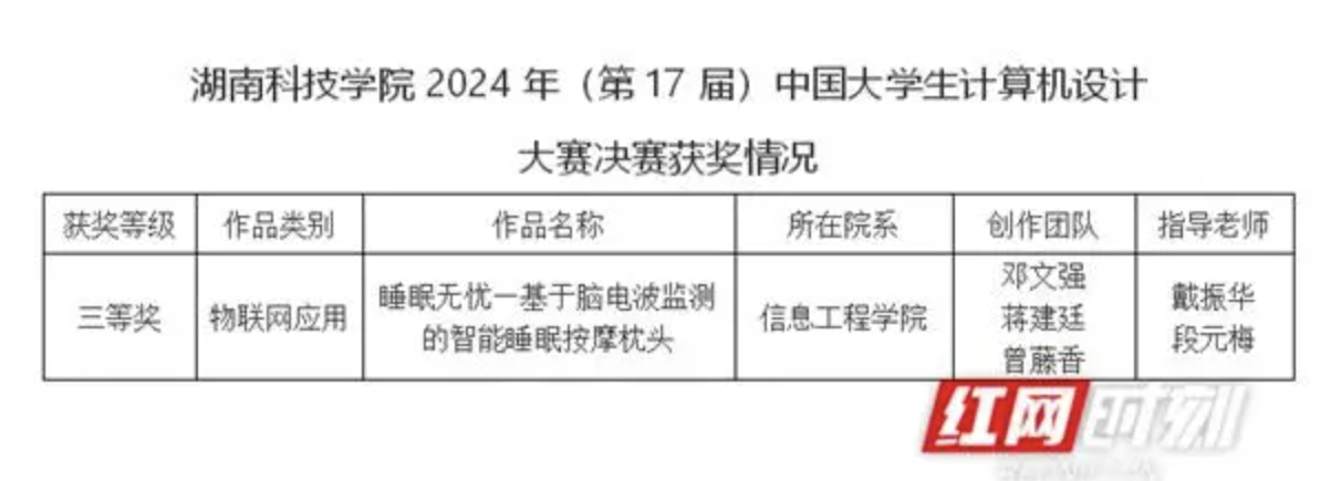 红网时刻新闻9月24日讯(通讯员 张彬 黄紫黎 向薛峰)近日,2024年(第17届)中国大学生计算机设计大赛在厦门举行。经过激烈角逐,华体会官方版网站登录入口信息工程学院学生邓文强、蒋建廷、曾藤香的参赛作品《睡眠无忧—基于脑电波监测的智能睡眠按摩枕头》荣获全国三等奖。