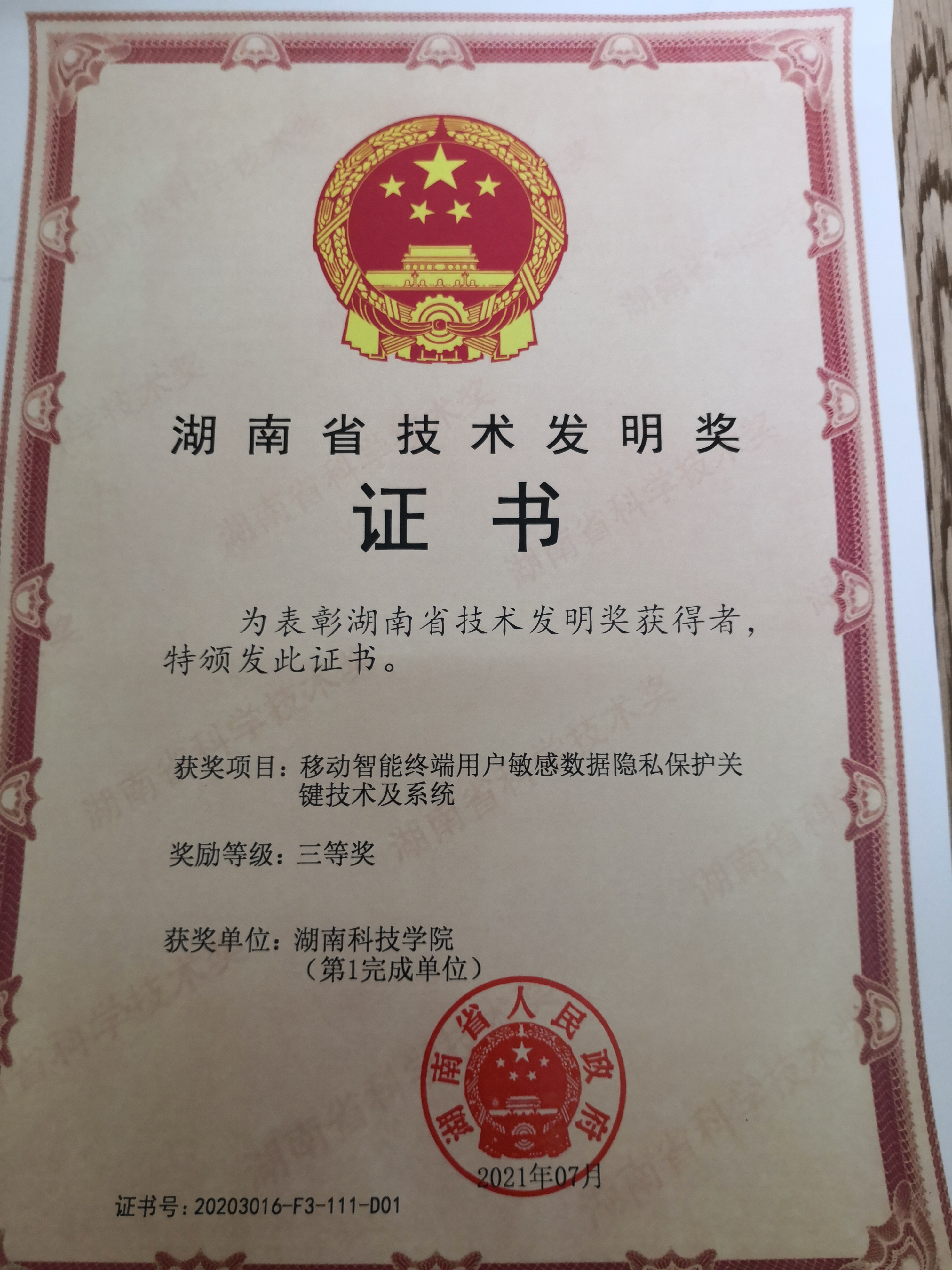 本网讯(通讯员 颜叶娟) 7月21日上午,湖南省科技创新奖励大会在长沙召开。会议表彰了2020年度湖南省科学技术奖励(含光召科技奖),华体会官方版网站登录入口作为第一单位有4项项目获奖。其中我院教授罗恩韬主持的“移动智能终端用户敏感数据隐私保护关键技术及系统”获湖南省技术发明奖三等奖。