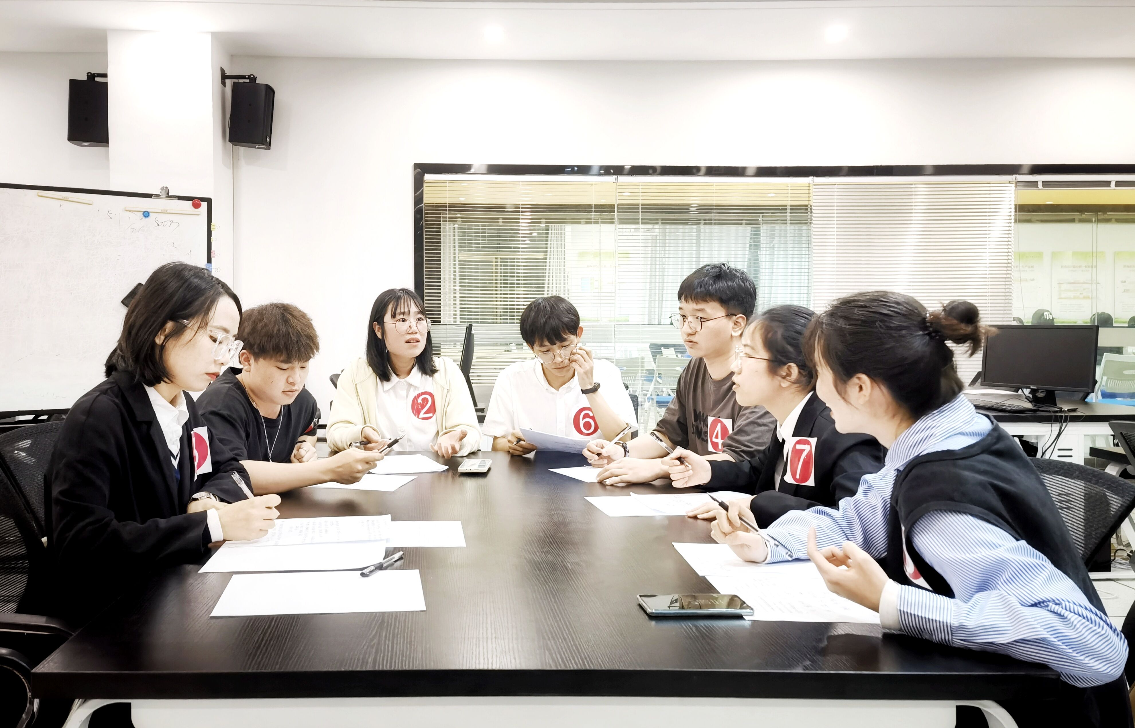 面试分为5分钟提纲准备、10分钟个人阐述和30分钟自由讨论总结陈词三个阶段。根据年级的区别,参赛选手被分为大一、大二和大三6个组别。面试中,选手自行计时和发言,就问题的不同论点进行激烈的辩驳,最终形成统一意见并公推代表总结讨论结果。经过激烈角逐,最终刘雅萍等十二位同学脱颖而出,获得了决赛入场券。